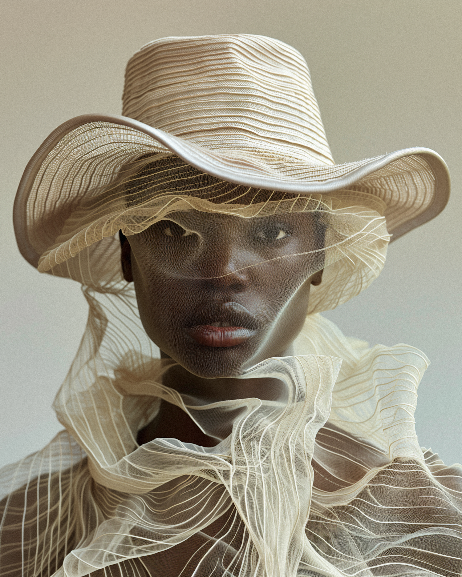 Elegant portrait of a woman in a textured, translucent hat and fabric, showcasing fluid design and serene expression.