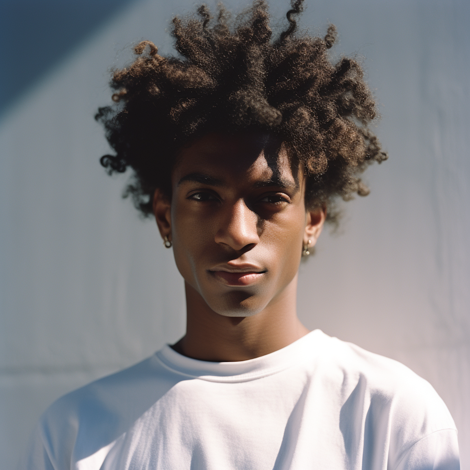 Portrait of a young man with a natural afro hairstyle, wearing a white t-shirt and hoop earrings, set against a neutral background.