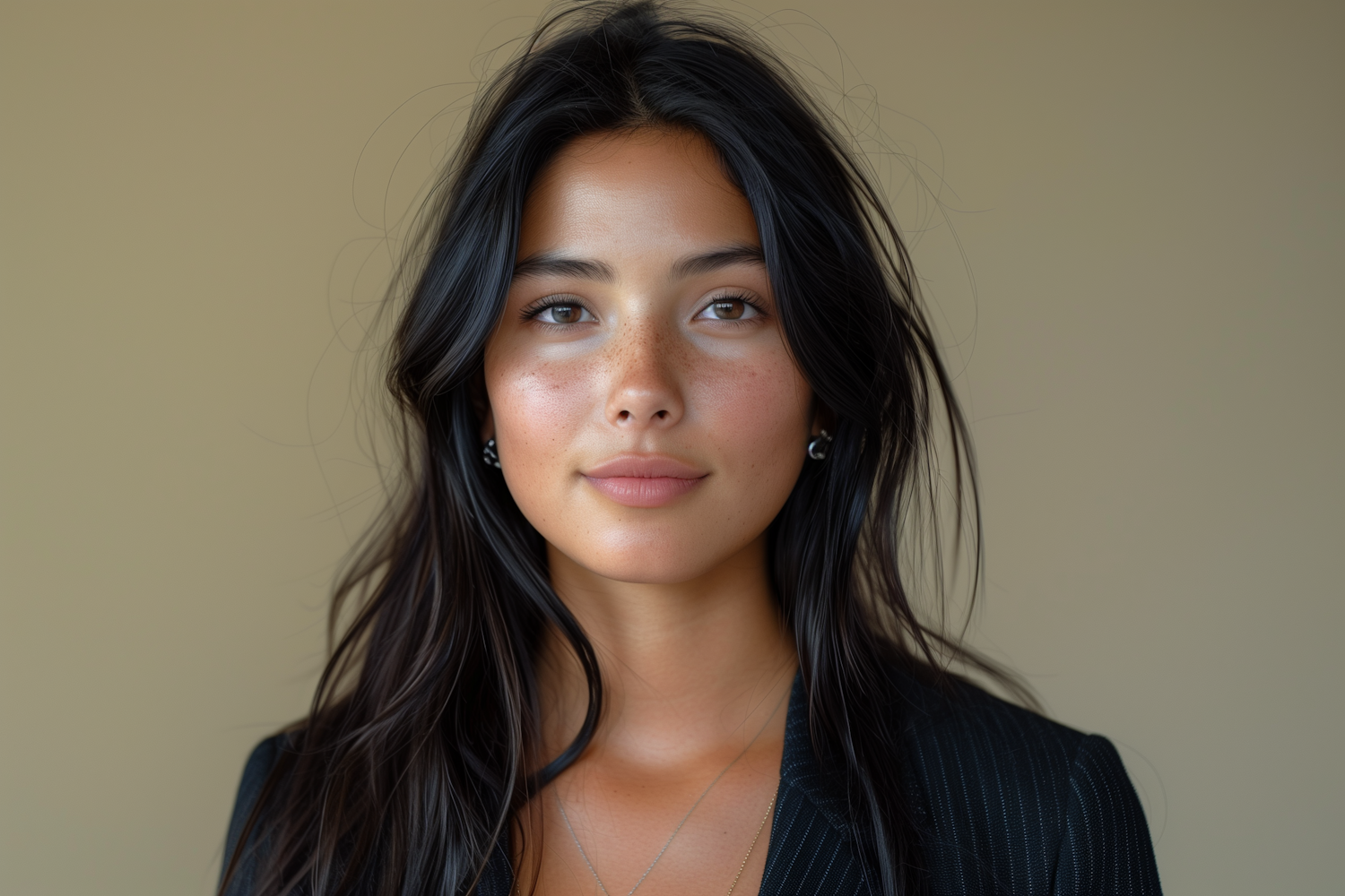 Portrait of a young woman with long dark hair, wearing a black blazer and hoop earrings, set against a neutral beige background.