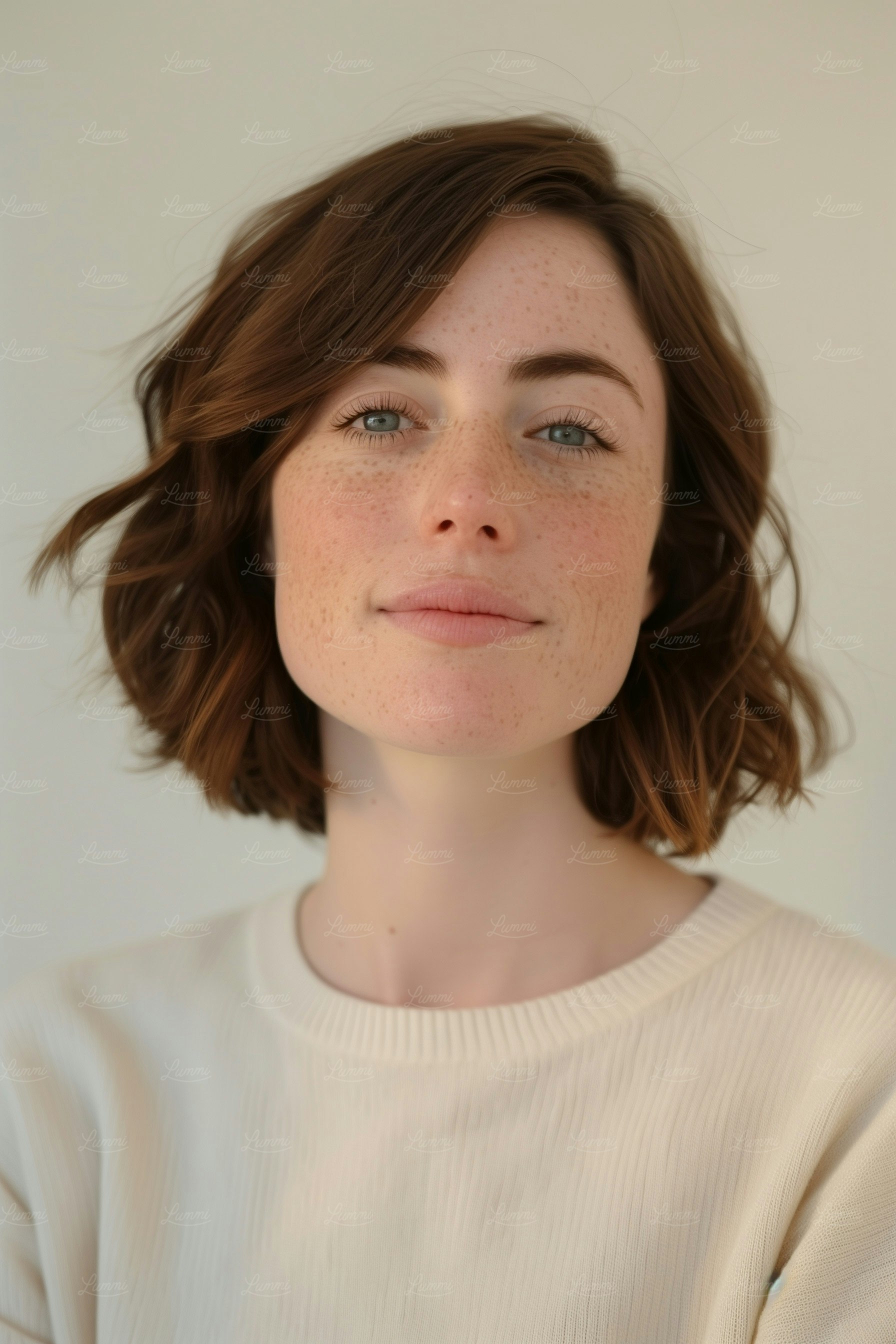 Portrait of a young woman with freckles, short brown hair, and blue eyes, wearing a cream sweater against a neutral background.