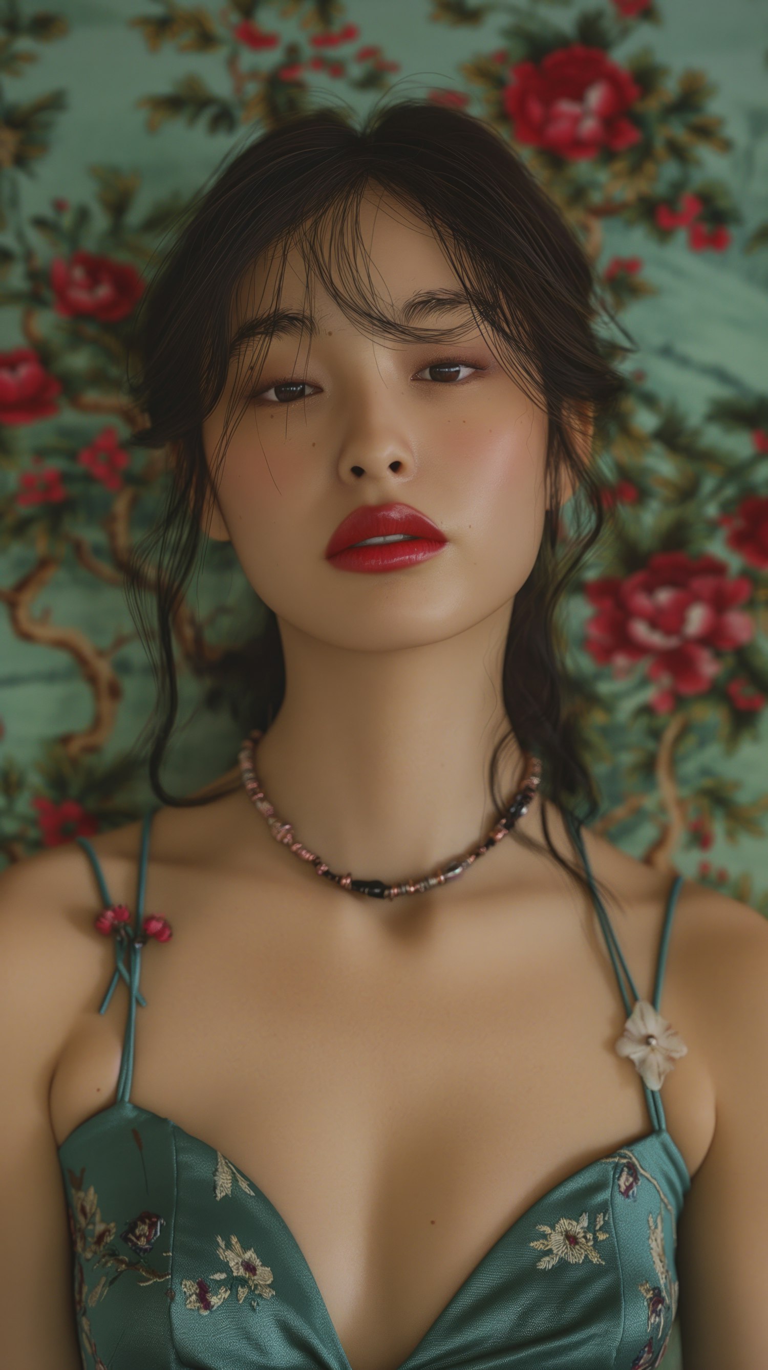 Asian woman with red lips and teal floral dress against a matching floral background, exuding elegance and serenity.