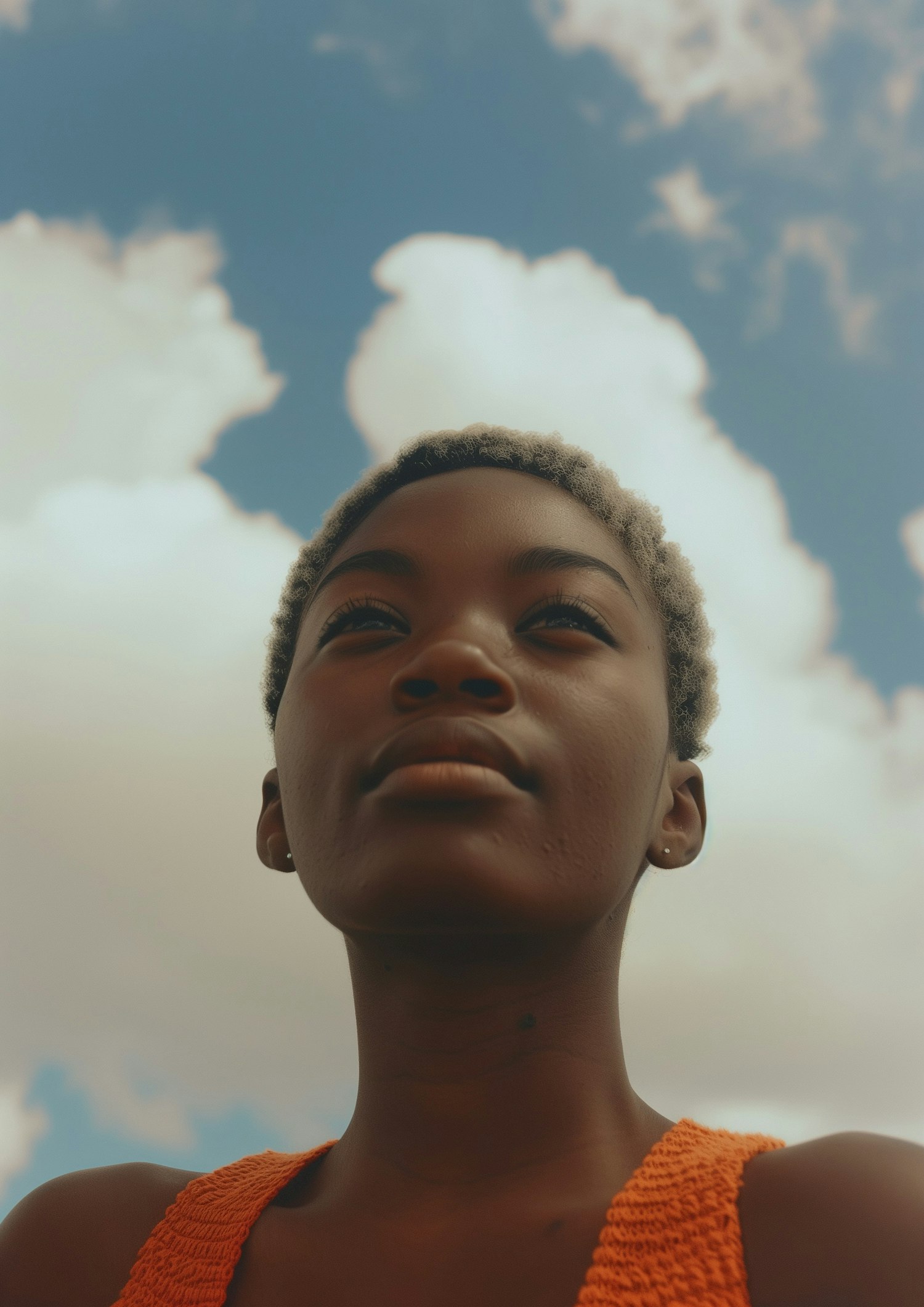 Young woman with short curly hair gazes upward against a blue sky with clouds, wearing an orange top. Serene and contemplative mood.