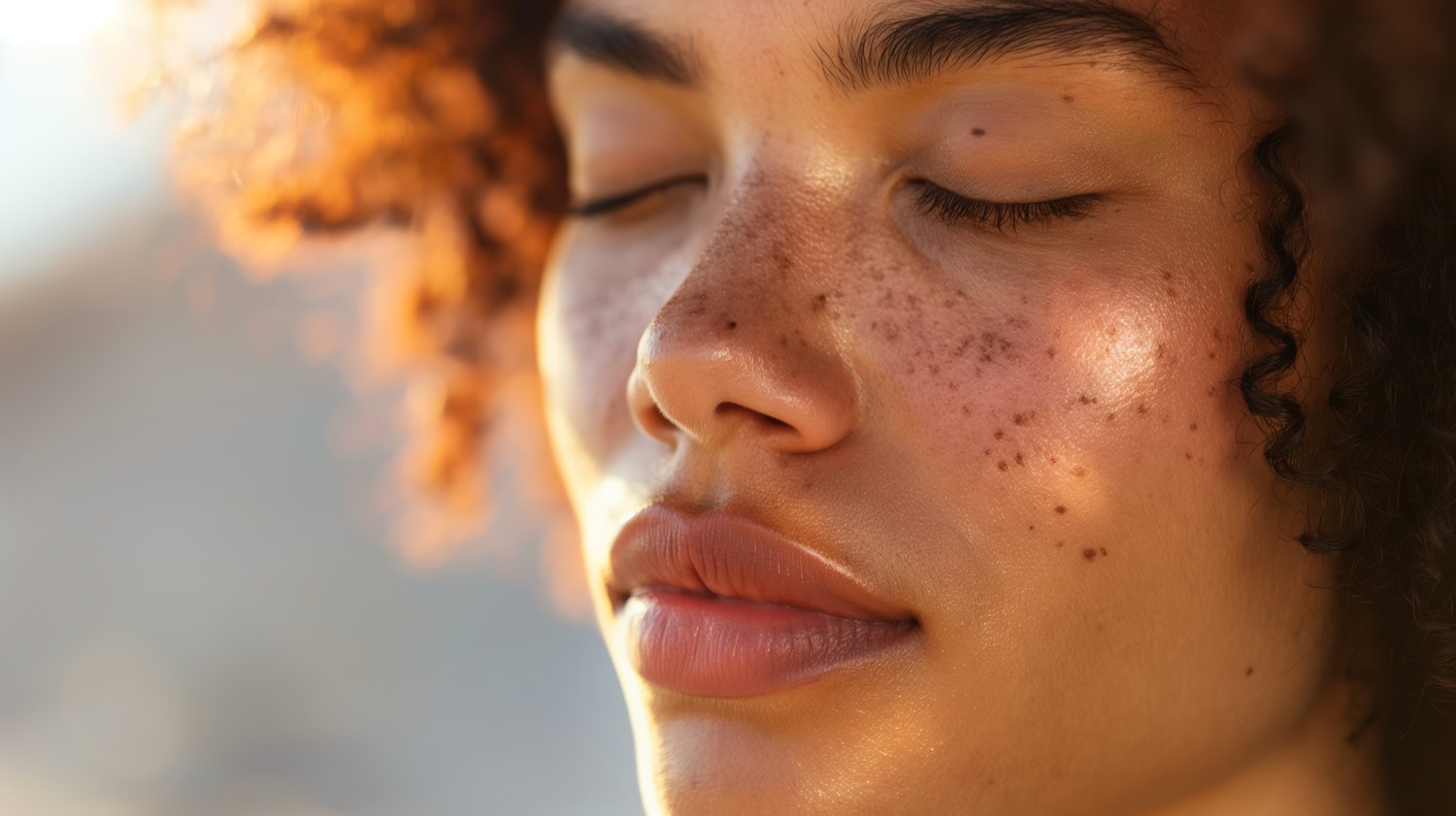 Close-up of a serene woman with curly hair and freckles, eyes closed, basking in warm light. Natural beauty and tranquility captured.