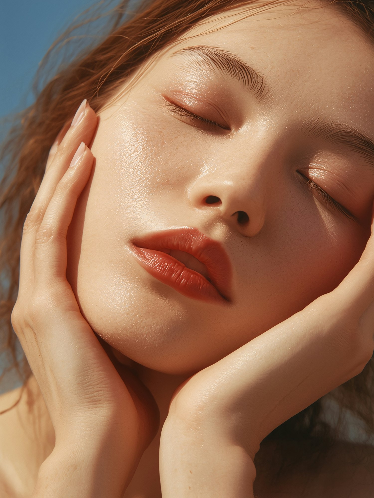Close-up of a serene face with closed eyes, soft red lips, and glowing skin, framed by hands against a blurred background.
