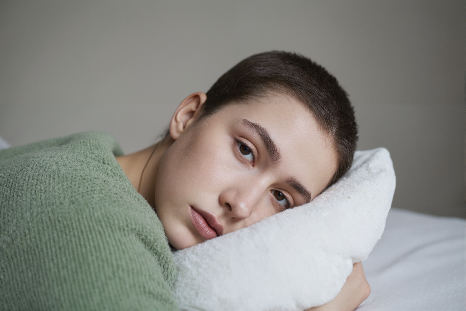 Young woman with short hair in a green sweater resting on a white pillow, gazing softly at the camera in a serene setting.