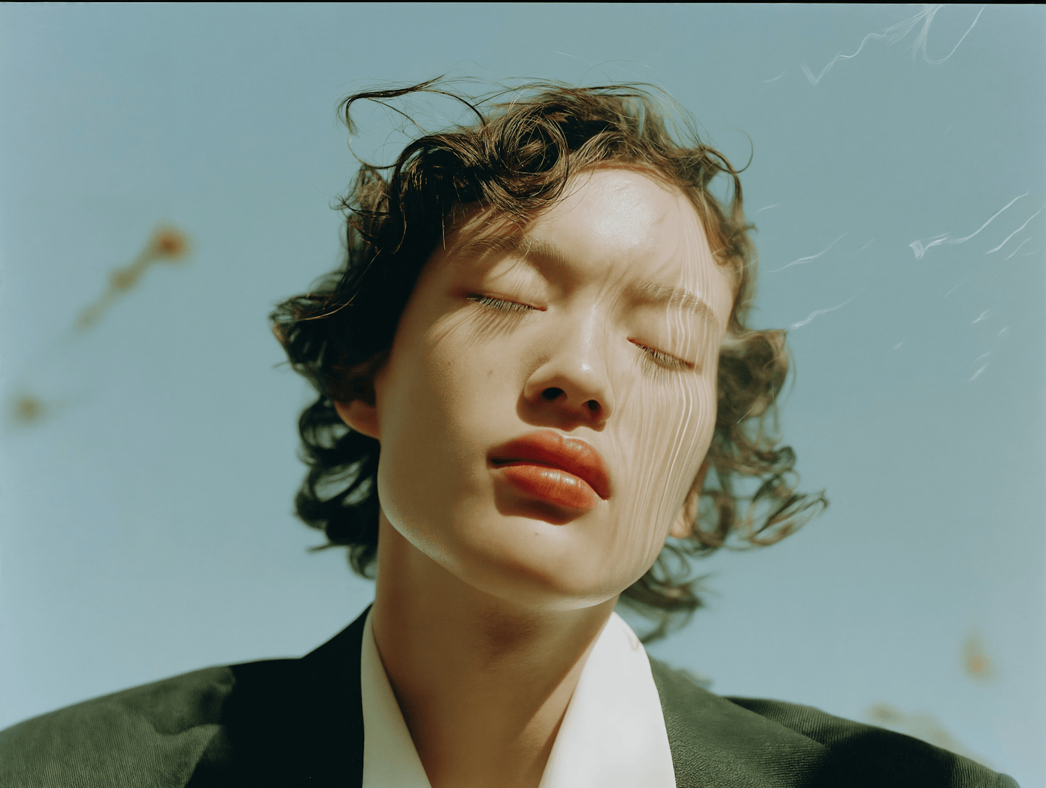 A serene close-up portrait of a person with closed eyes, wavy hair, and a formal outfit, set against a clear blue sky.