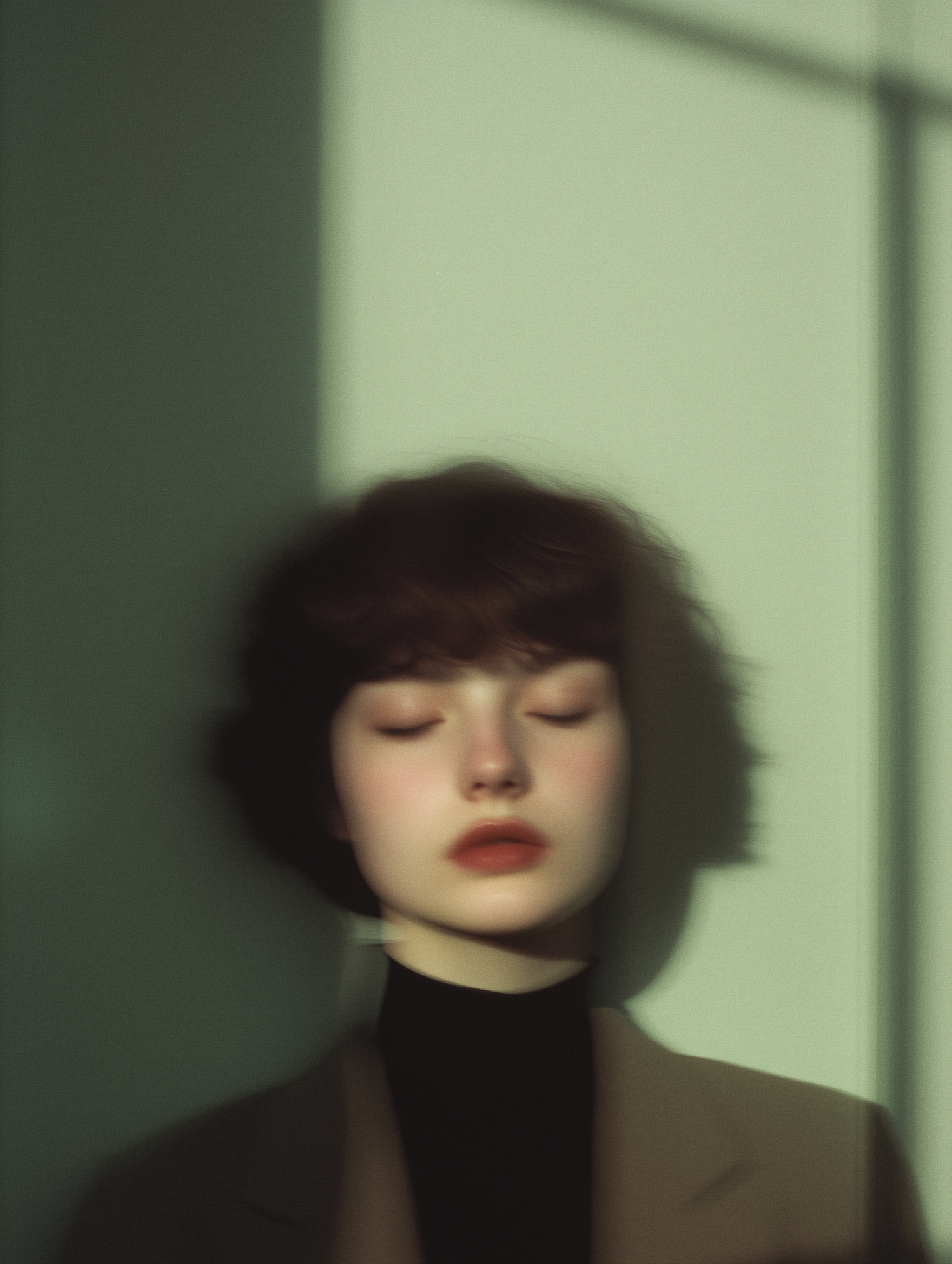 Serene portrait of a young woman with closed eyes, soft lighting, and muted colors creating a tranquil atmosphere.