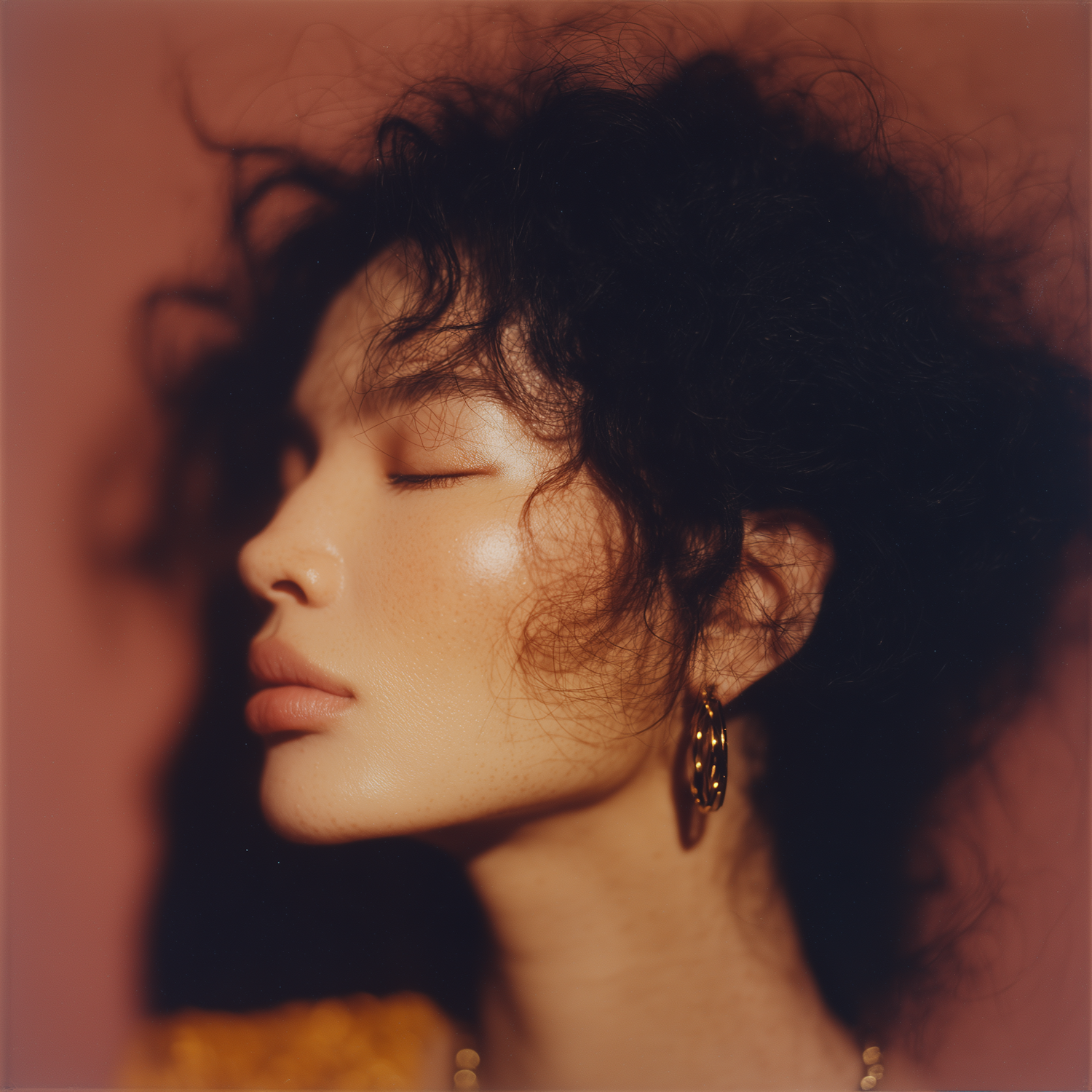 Close-up portrait of a serene individual with curly hair, glowing skin, and gold hoop earrings against a warm-toned background.