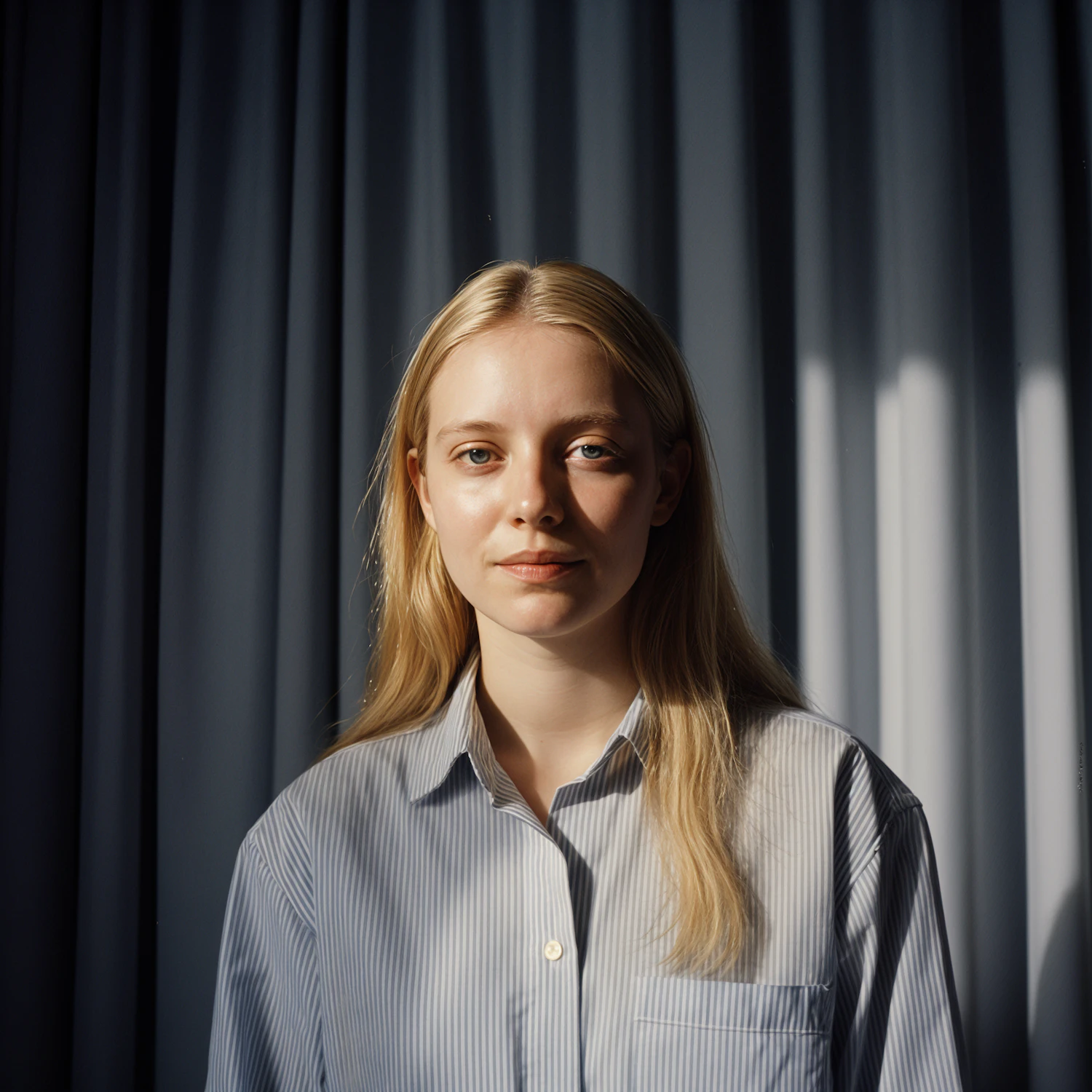 A serene portrait of a young woman with blonde hair and a light blue shirt, softly lit against a backdrop of muted curtains.