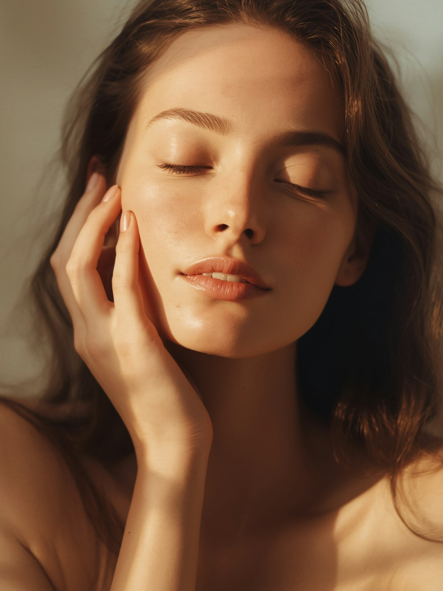 A serene close-up of a young woman with closed eyes, soft lighting, and a peaceful expression, highlighting natural beauty.