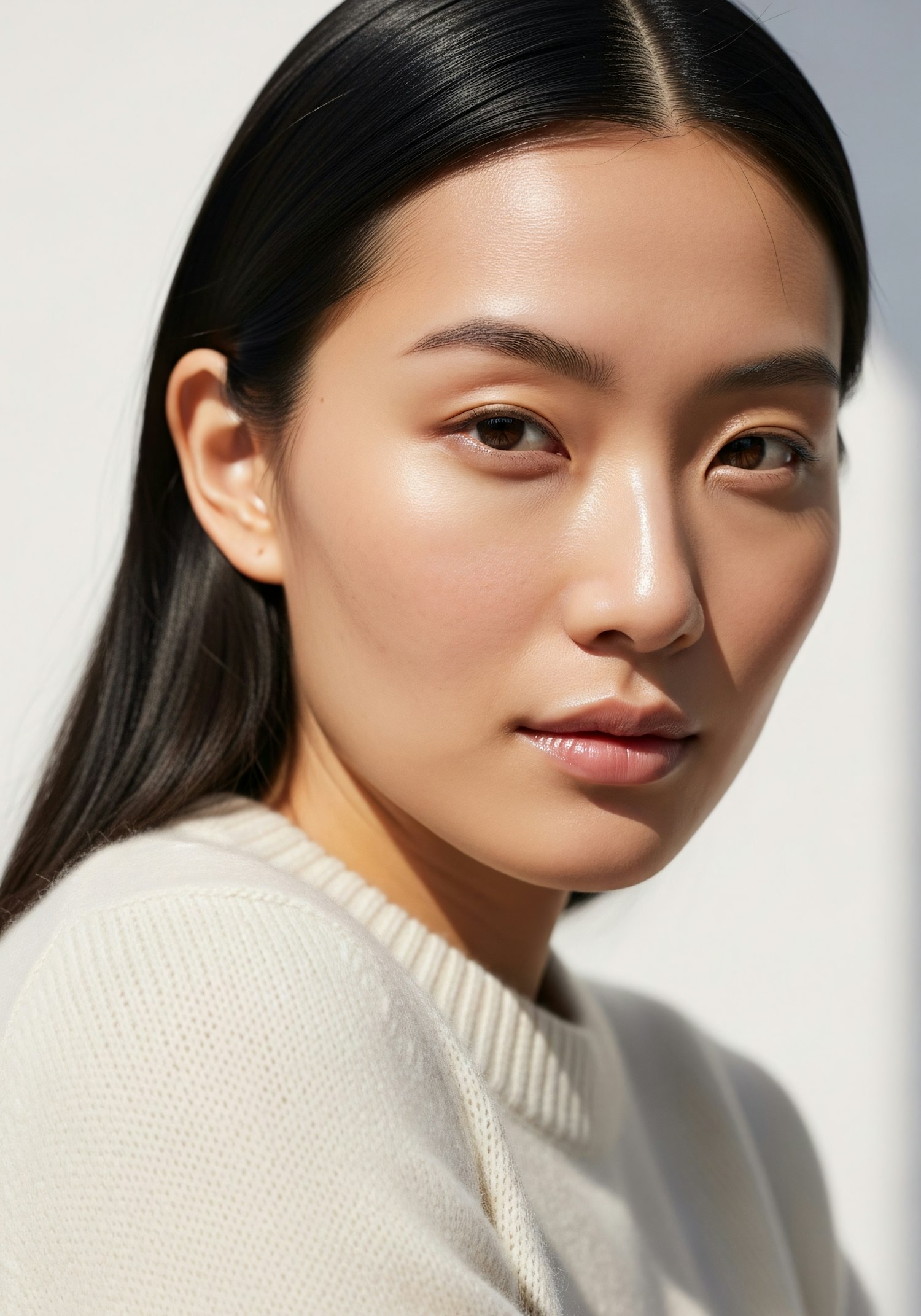Close-up portrait of a person with radiant skin and dark hair, wearing a light sweater, captured in soft lighting.