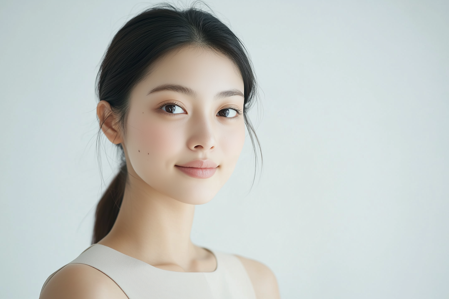 Portrait of a young Asian woman with natural makeup, tied-back hair, and a serene expression against a soft gray background.