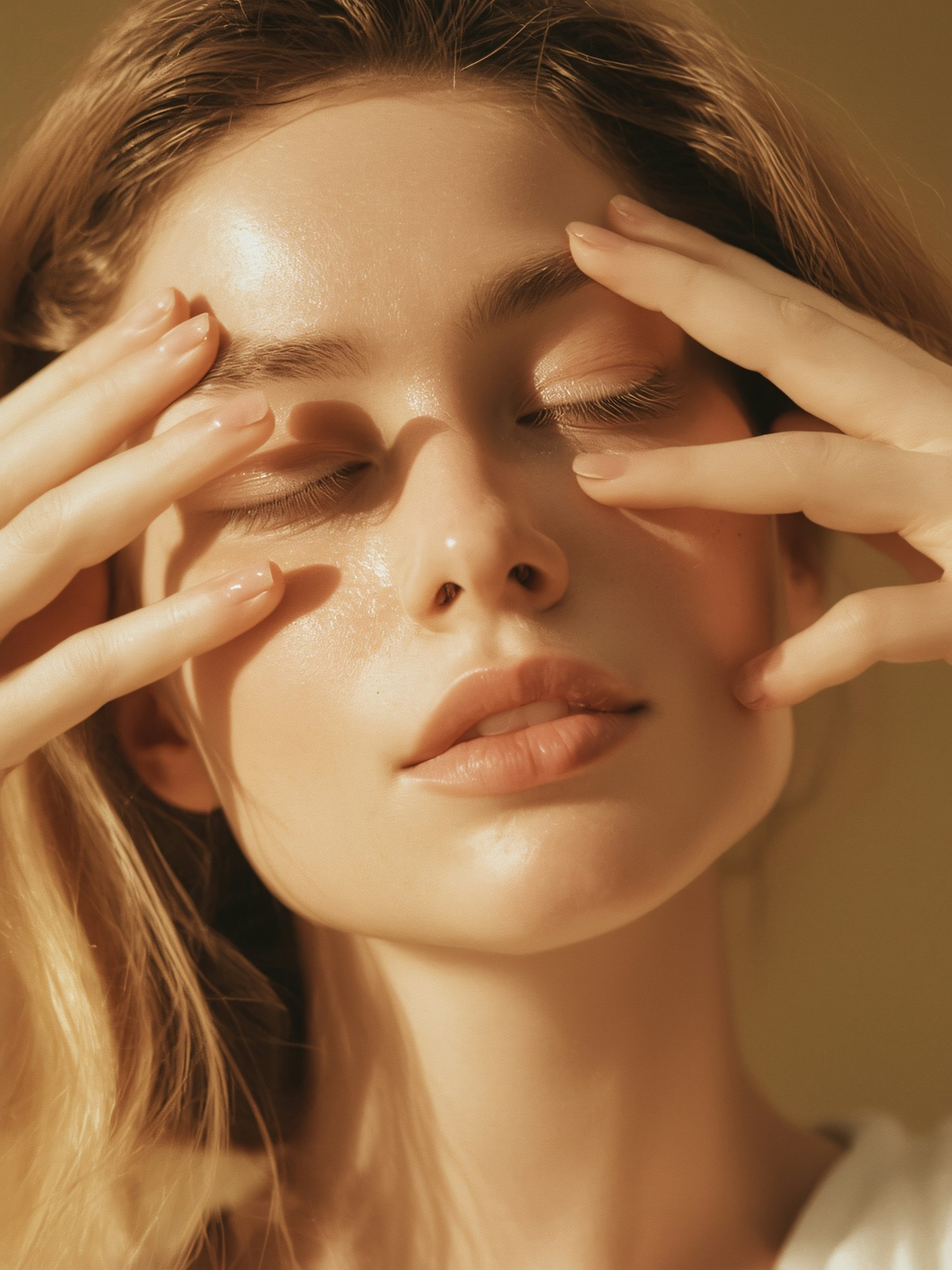 Close-up of a serene individual with closed eyes, warm lighting highlighting their natural features and soft expression.