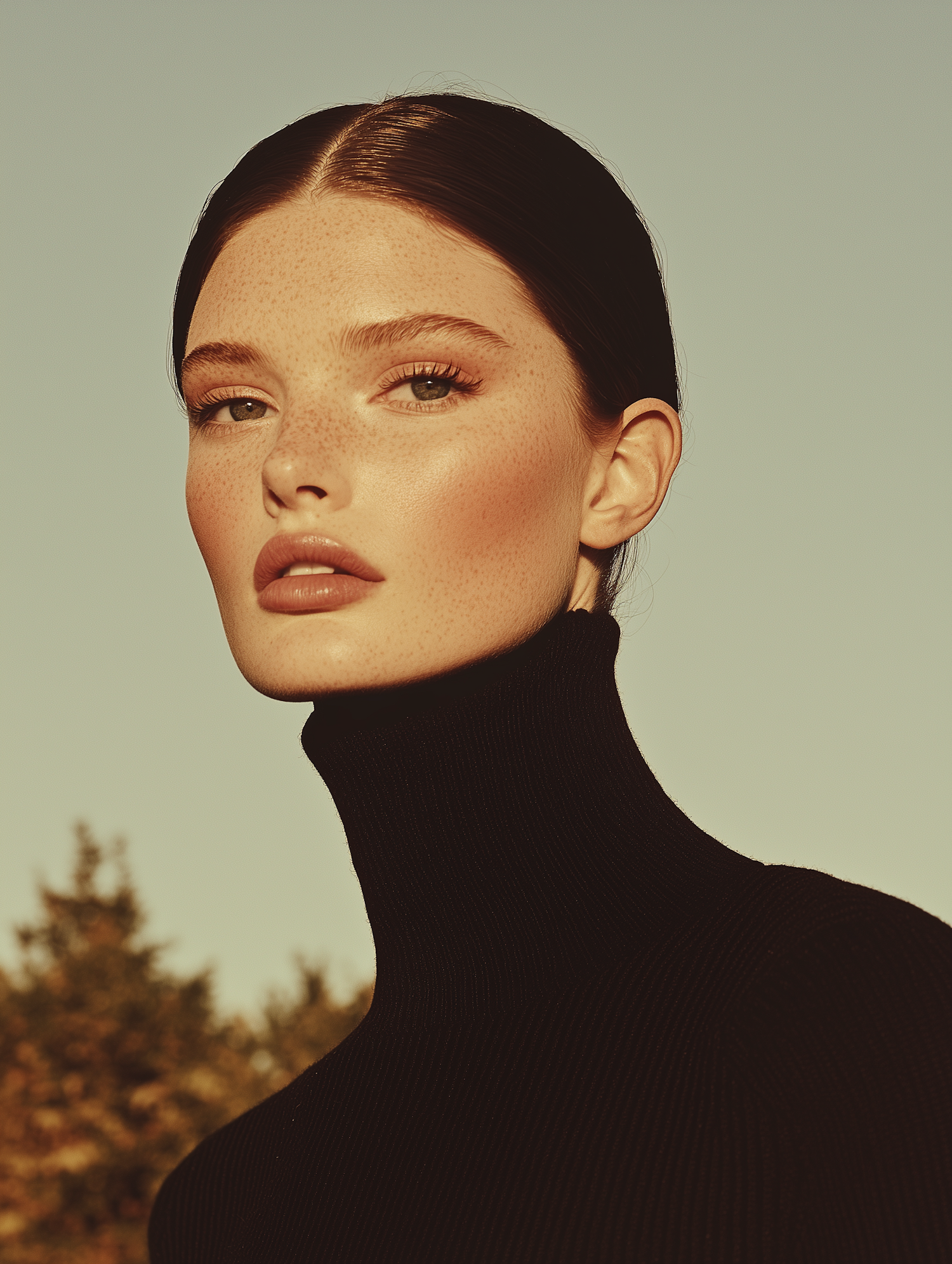 Elegant portrait of a freckled woman in a black turtleneck, set against a golden sunset with blurred trees in the background.