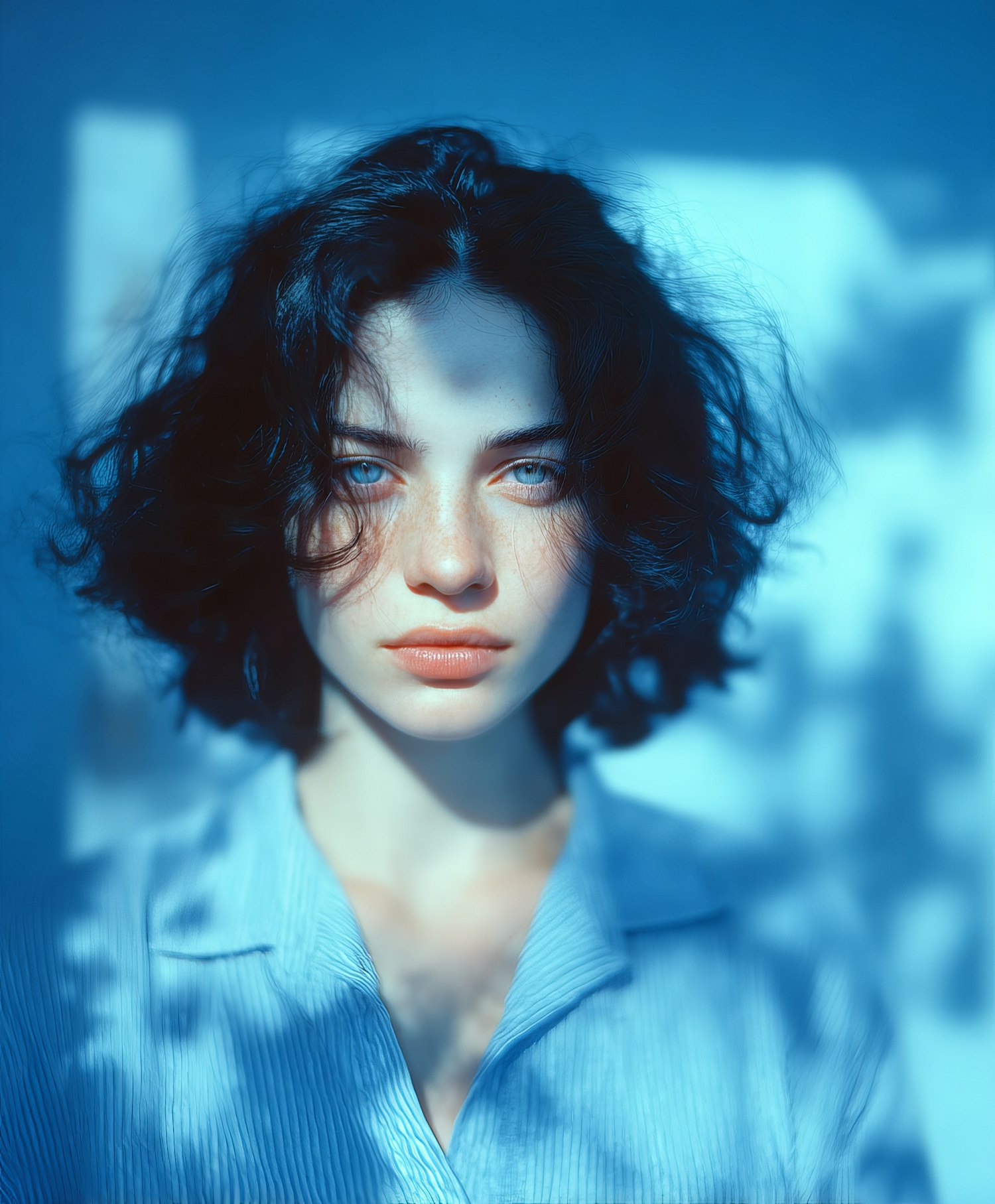 A serene portrait of a young woman with blue eyes and dark hair, bathed in soft blue light and shadows, creating a tranquil atmosphere.