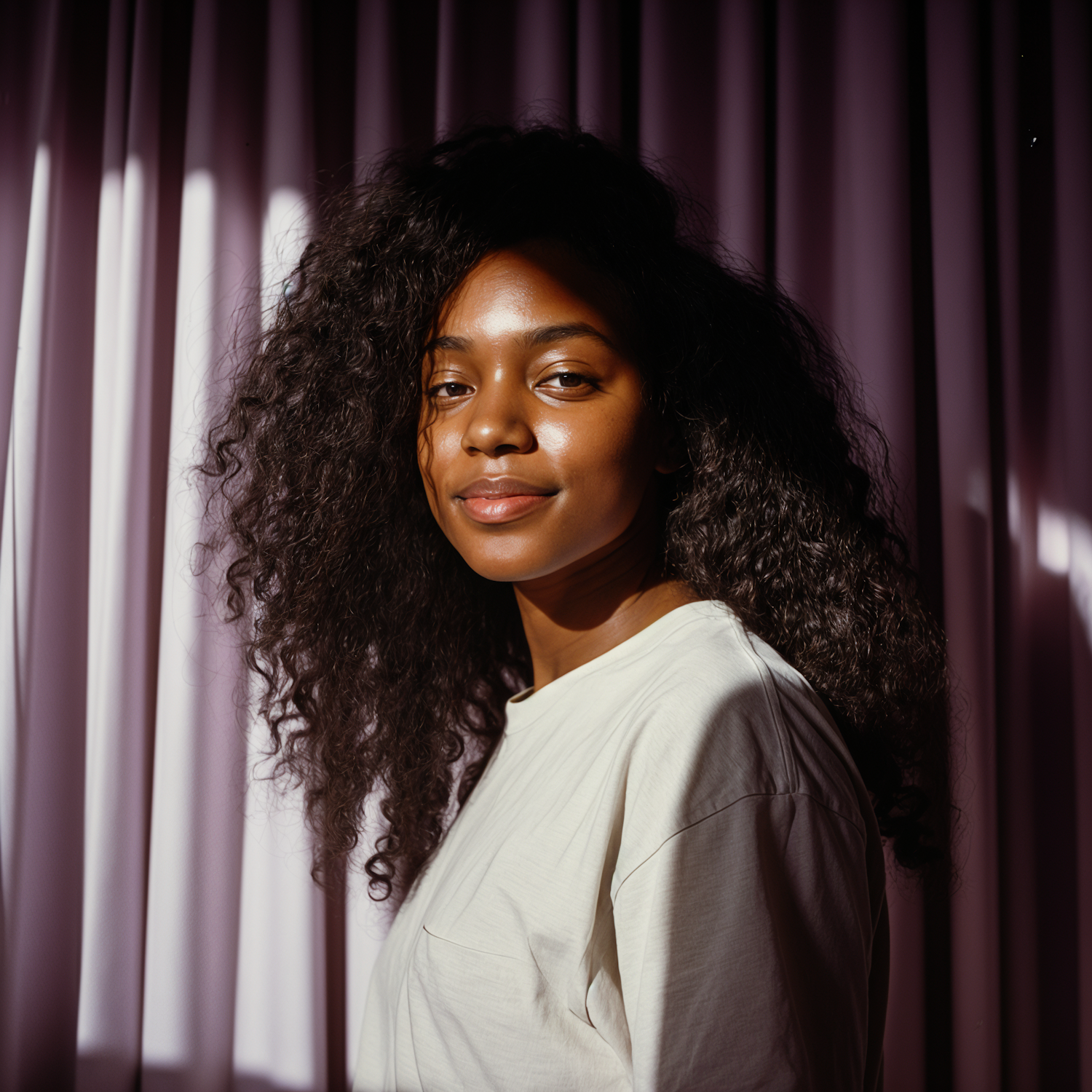 A young woman with curly hair and a serene expression stands against lavender curtains, bathed in soft sunlight.