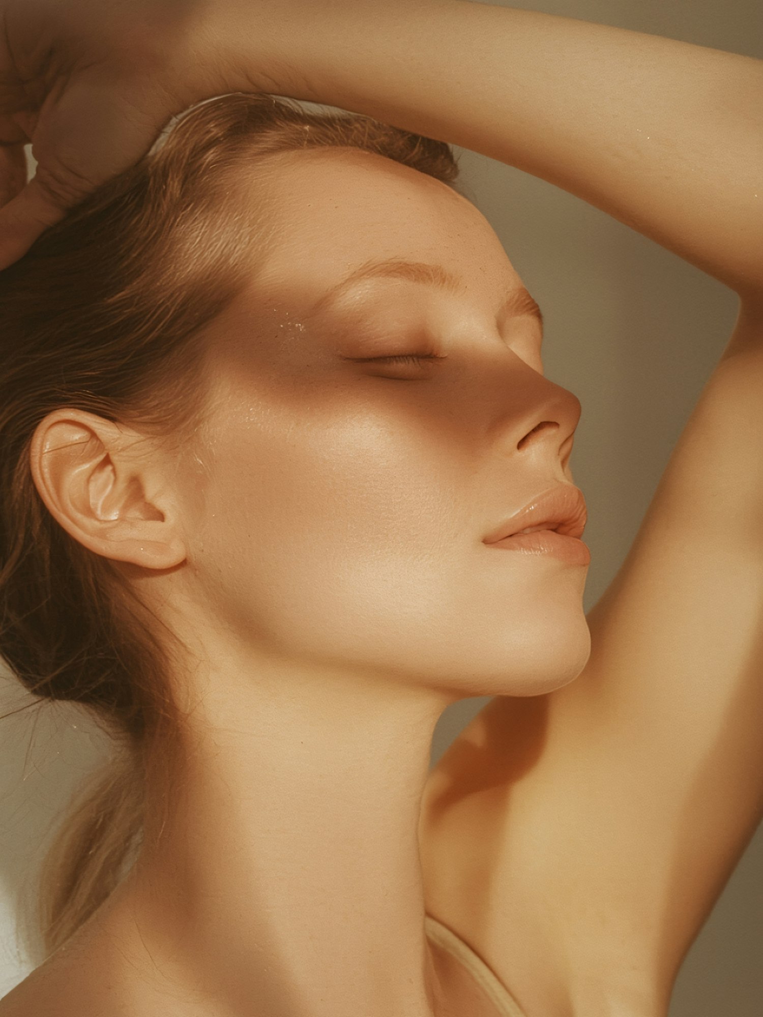 Close-up portrait of a serene individual with soft lighting and shadows, highlighting their smooth complexion and relaxed pose.
