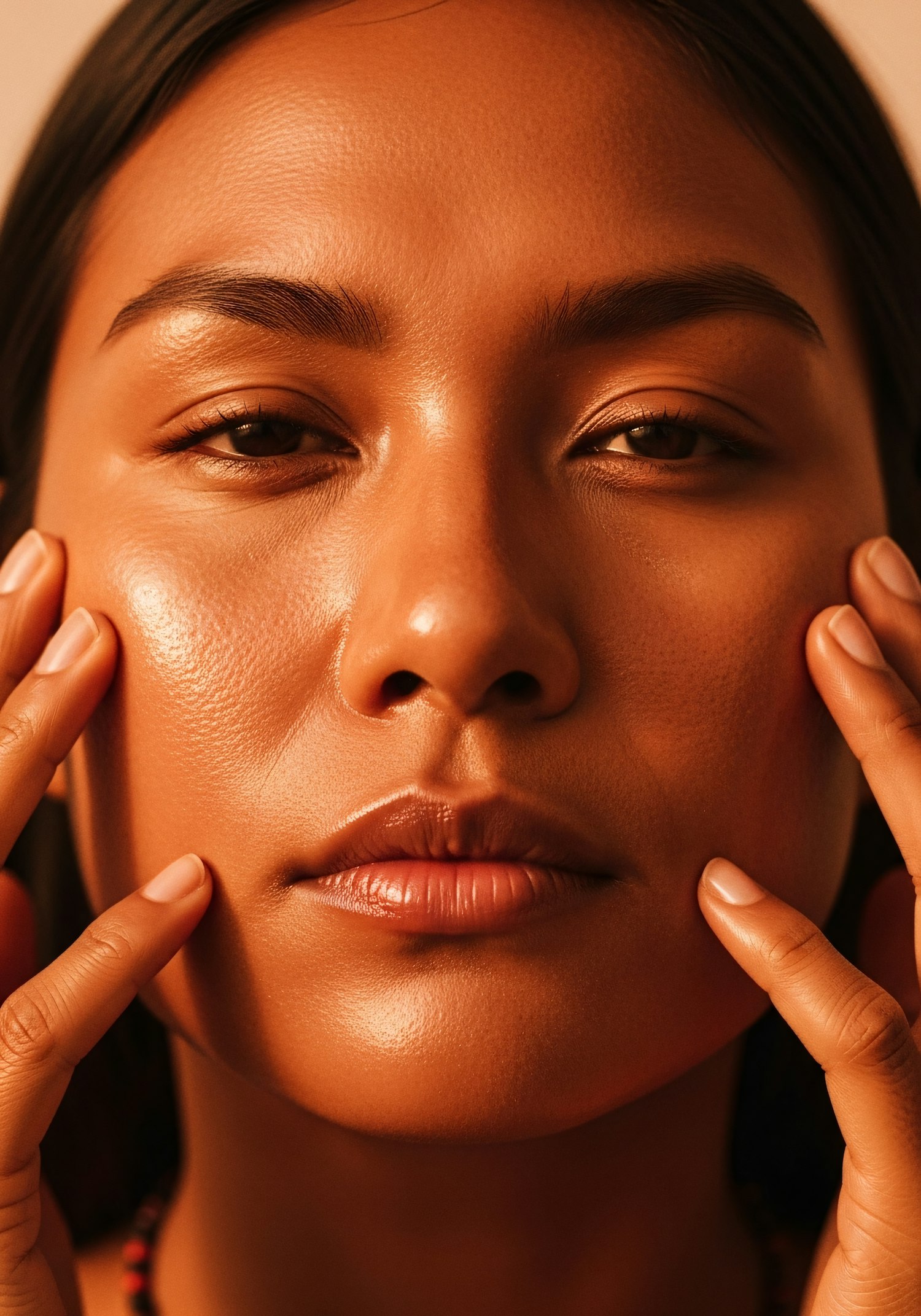 Close-up of a serene individual with glowing skin, gently touching their face, captured in warm, natural lighting.