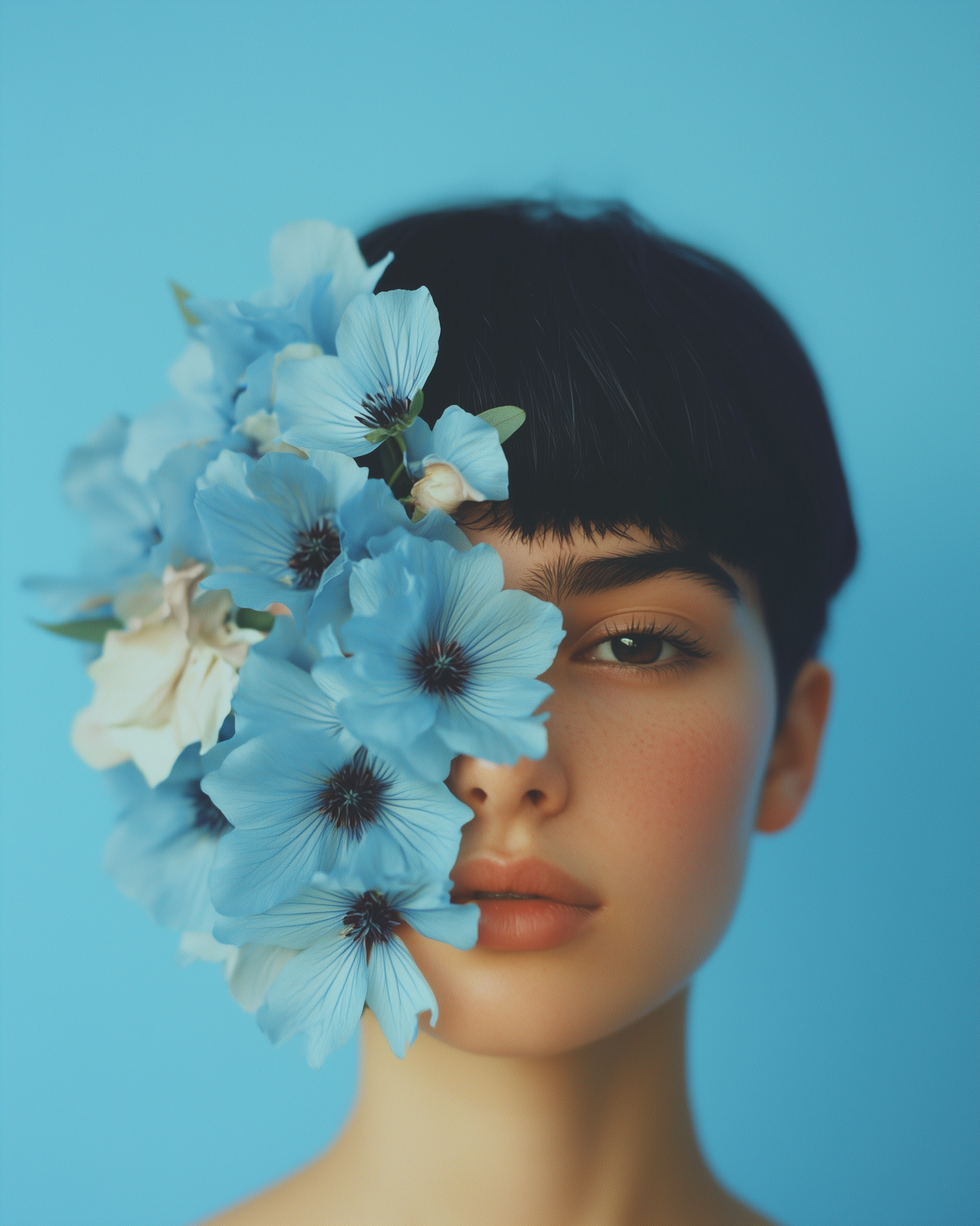 A serene portrait of a woman with blue flowers adorning her face against a matching blue background.