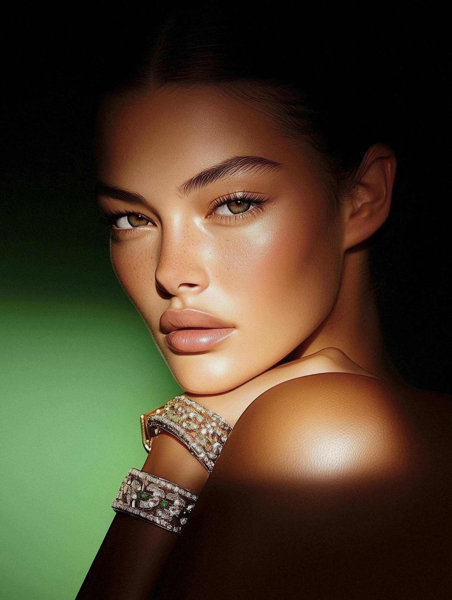 Elegant portrait of a woman with green eyes, wearing jeweled bracelets, set against a green background. Striking and sophisticated.