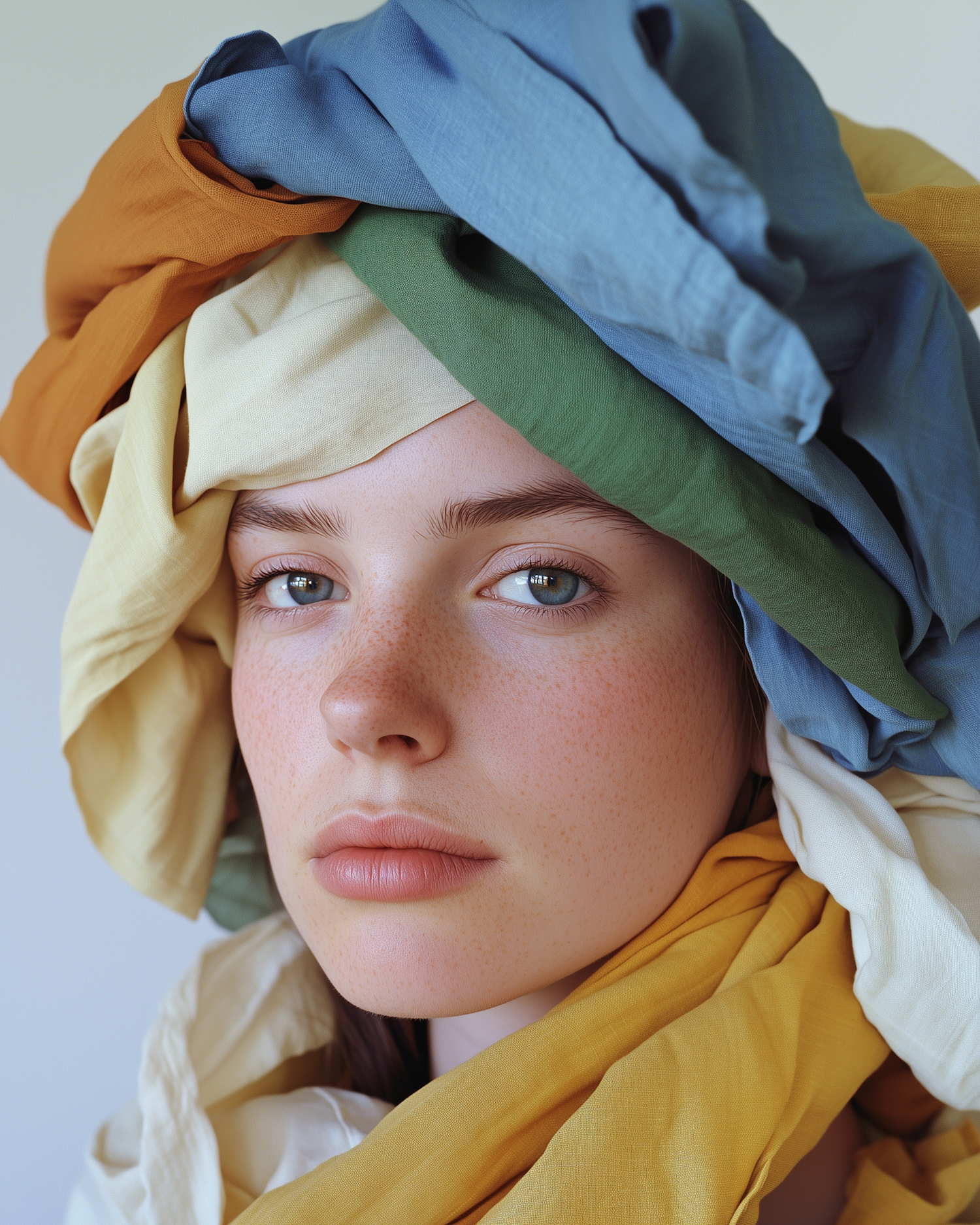 Portrait of a woman with colorful fabric headwrap, light blue eyes, and freckles, creating a vibrant and artistic look.