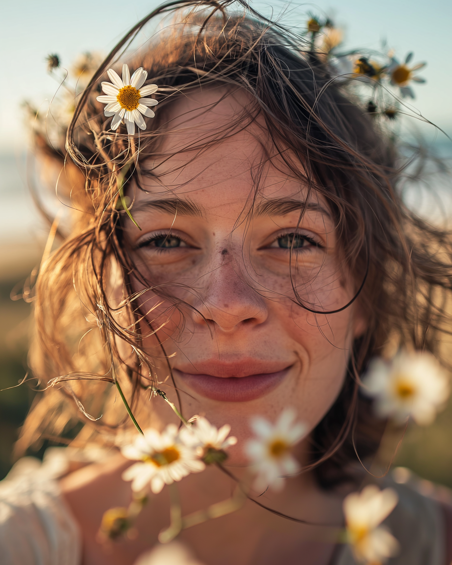 Close-up of a smiling woman with daisies in her hair, bathed in warm sunlight, creating a serene and natural vibe.