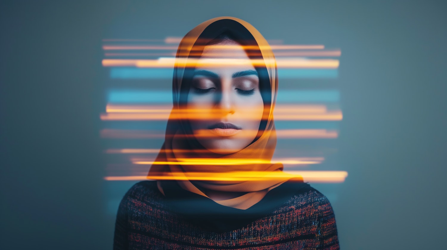 A serene woman in a mustard hijab with dynamic orange and blue light streaks across her face, creating a futuristic effect.