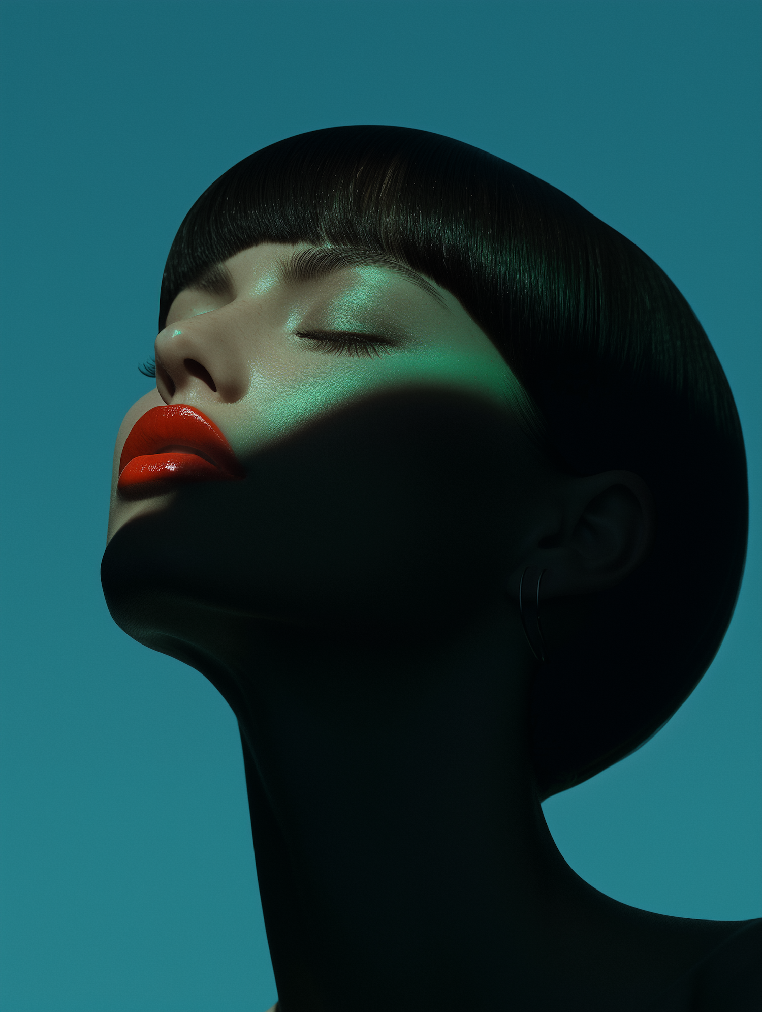 Artistic portrait of a woman with bold red lips and dramatic lighting against a teal background, exuding elegance and mystery.