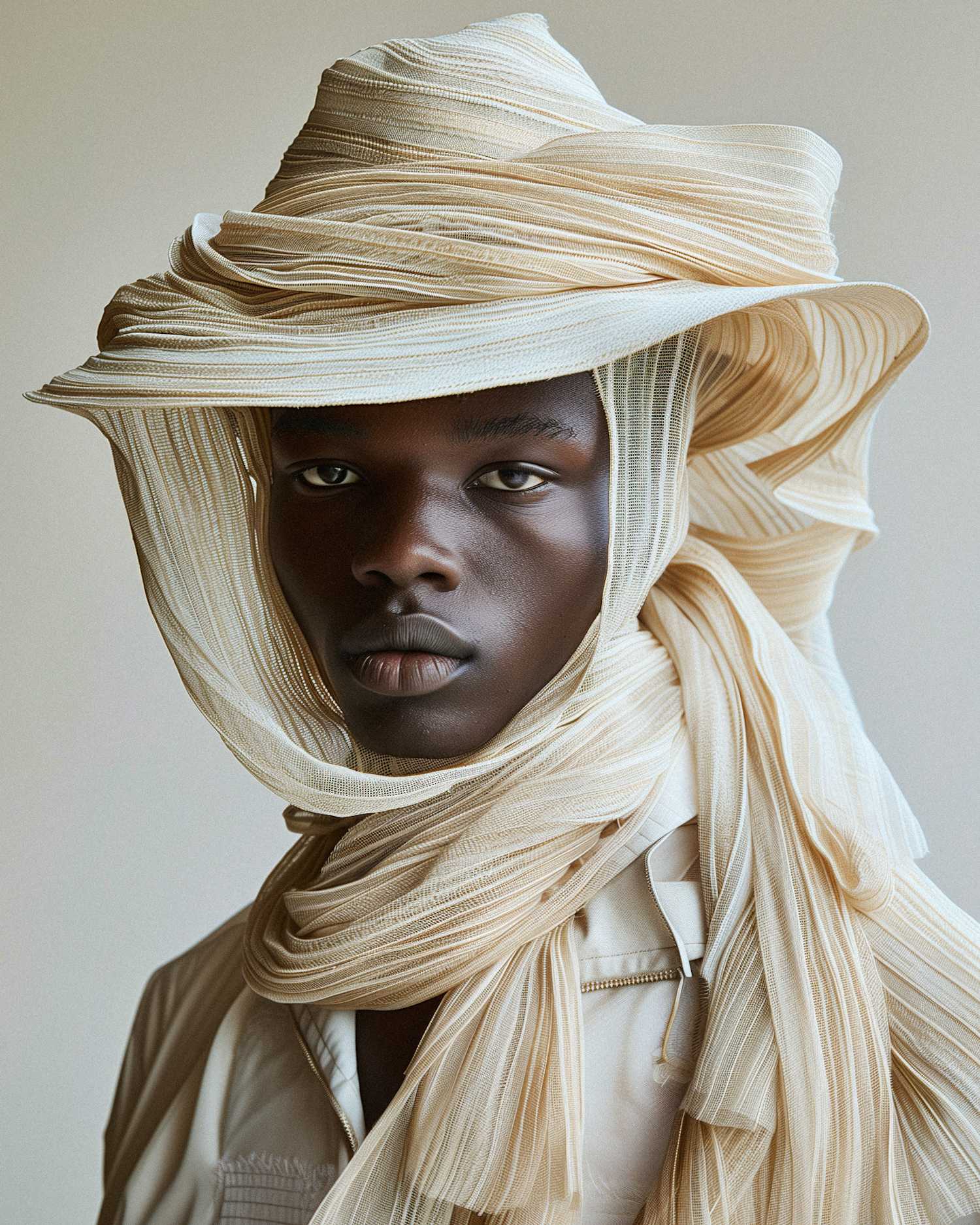 Elegant portrait of a person in a textured beige headpiece and scarf, showcasing artistic fashion and serene expression.