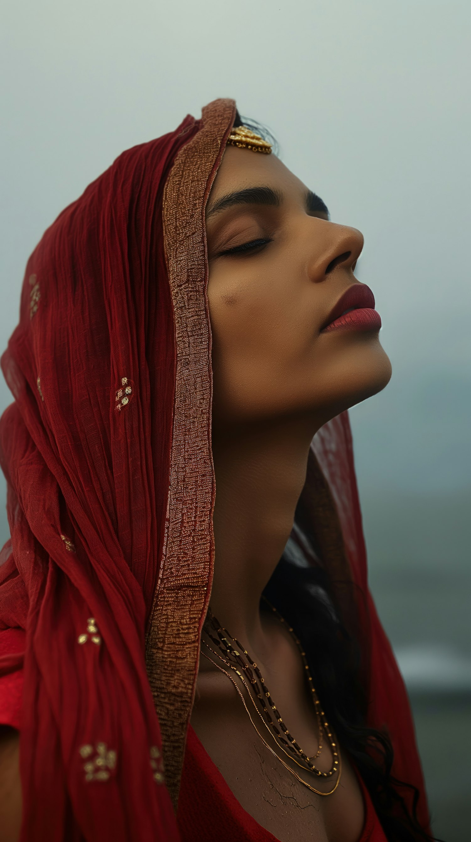 Serene portrait of a woman in a red veil with gold embroidery, eyes closed, exuding elegance and tranquility.