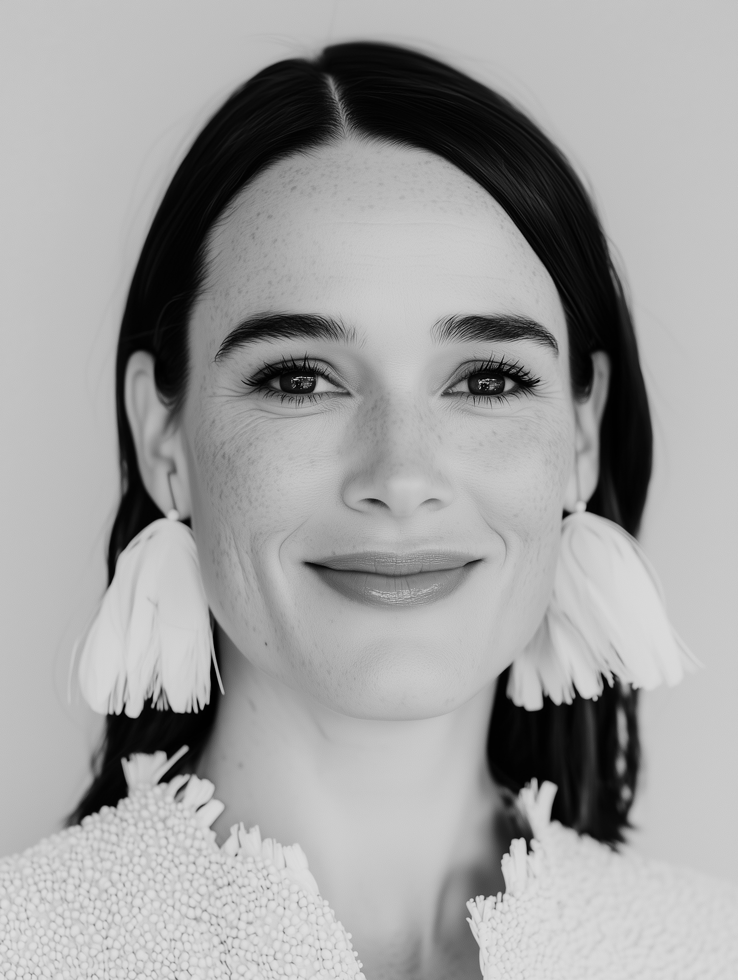 Black and white portrait of a woman with feather earrings and textured clothing, showcasing elegance and style.