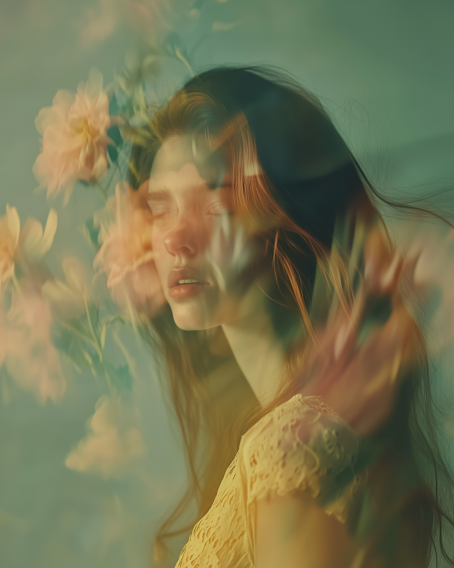 Ethereal portrait of a woman with closed eyes, overlaid with soft, blurred flowers, creating a dreamy, surreal atmosphere.