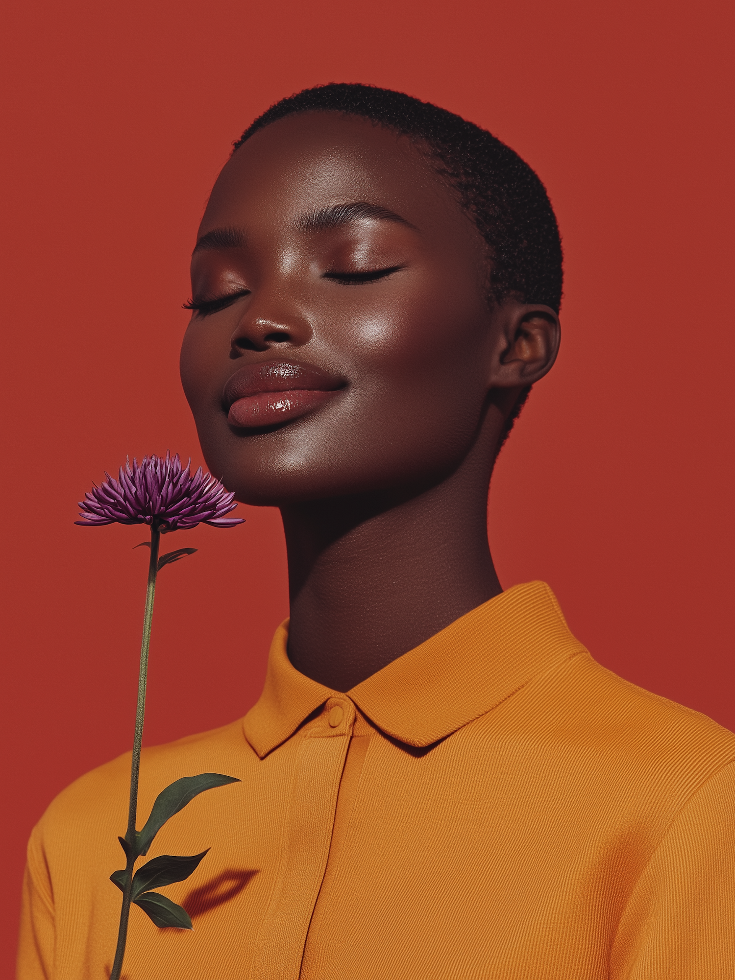 Elegant portrait of a serene woman holding a purple flower, wearing an orange shirt against a bold red background.