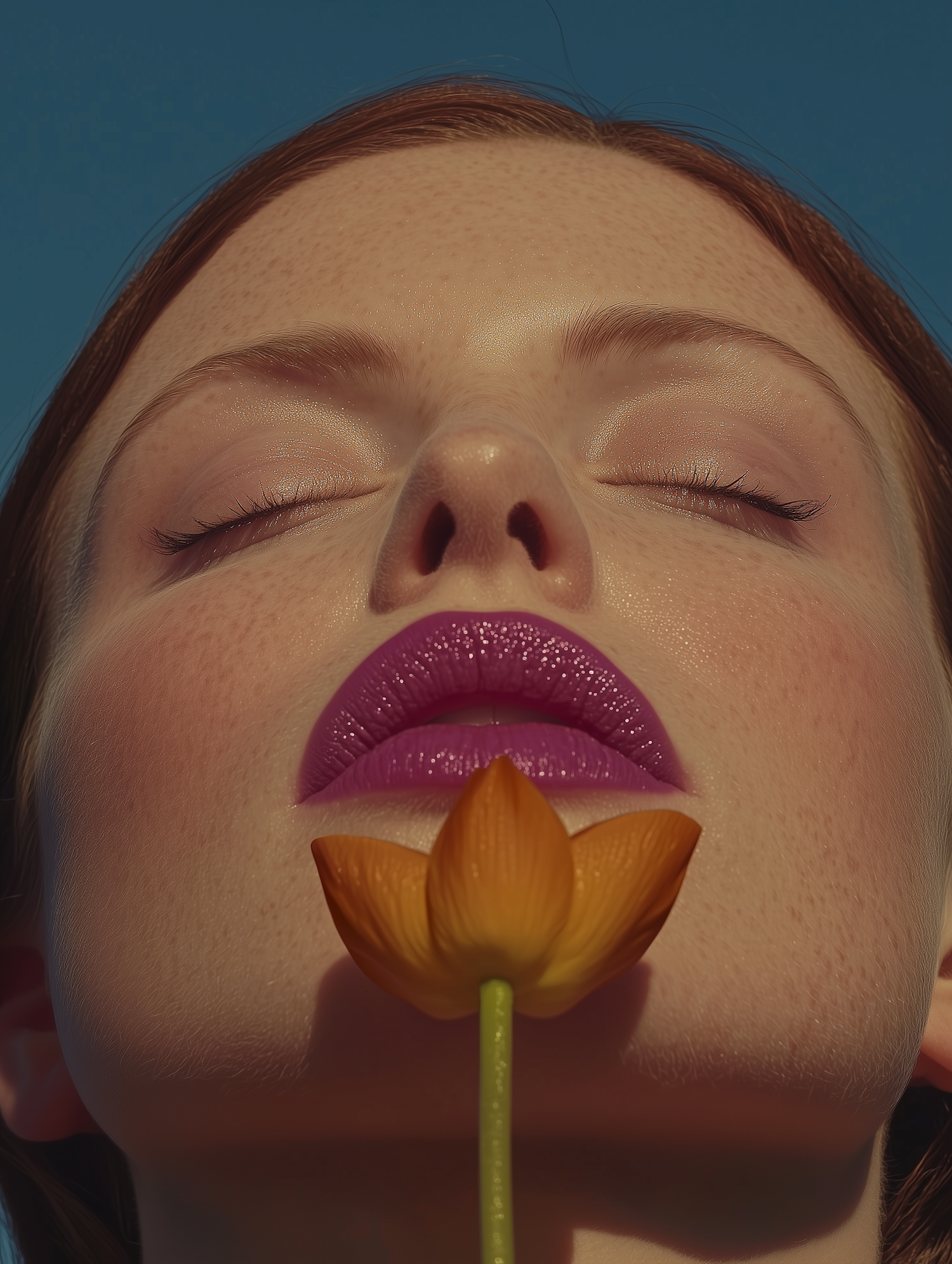 Close-up of a serene woman with purple lips and an orange flower against a blue sky, highlighting vibrant contrasts.