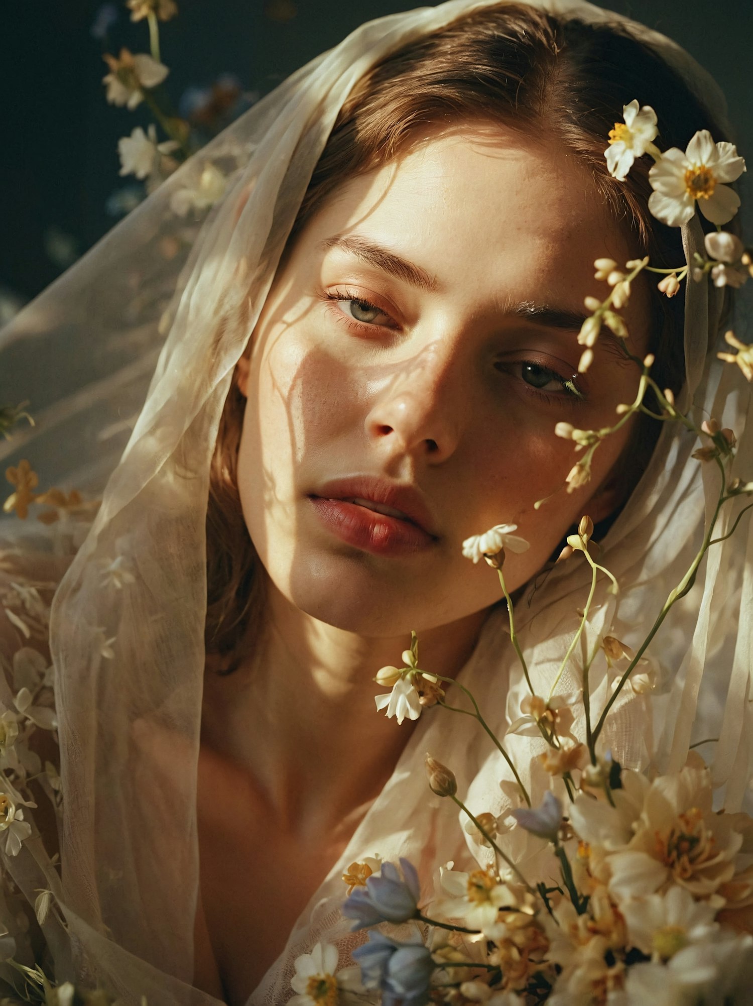 Serene portrait of a woman with a veil and flowers, bathed in soft sunlight, creating an ethereal and tranquil atmosphere.
