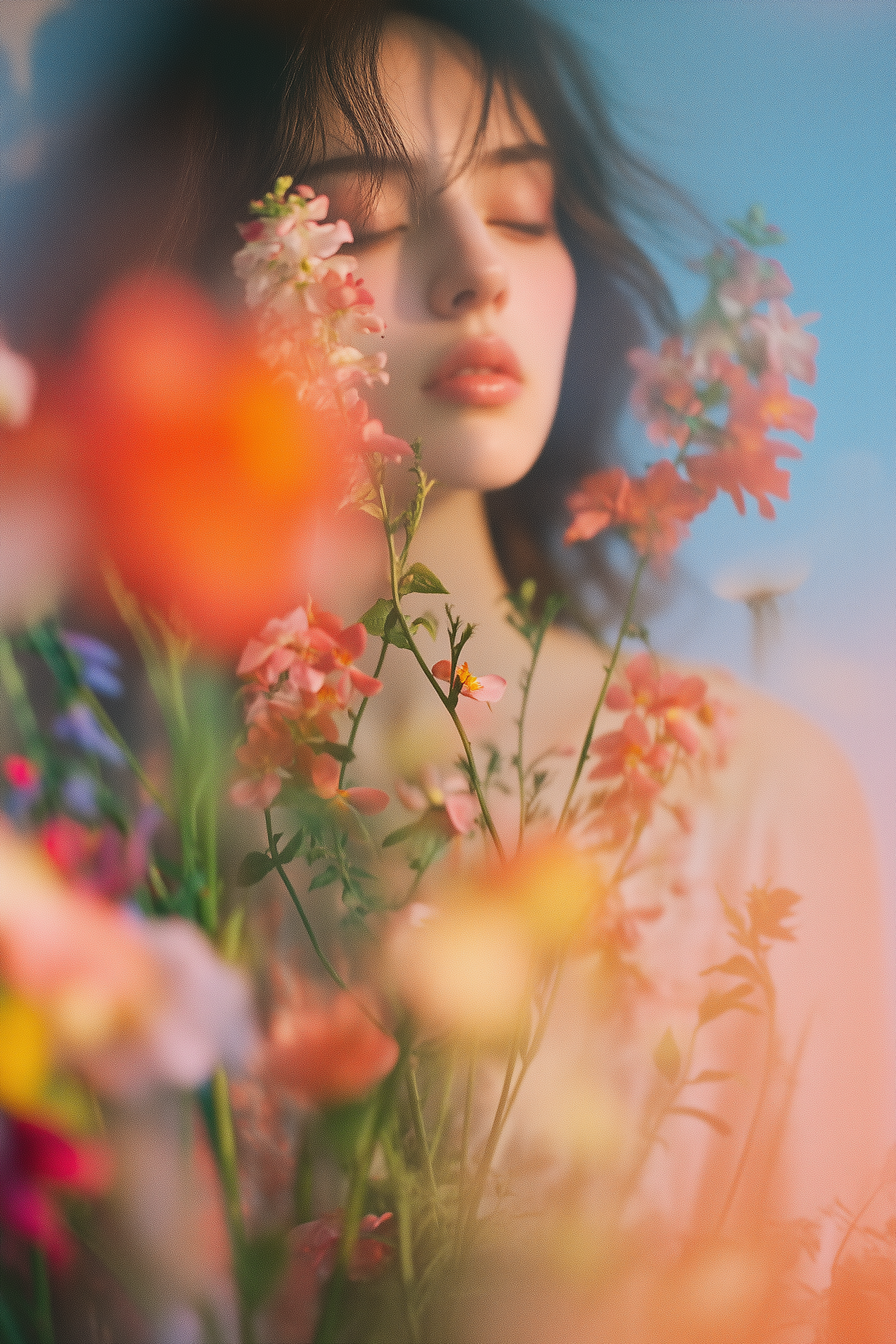 Serene woman with closed eyes surrounded by vibrant flowers, creating a dreamy and tranquil atmosphere.