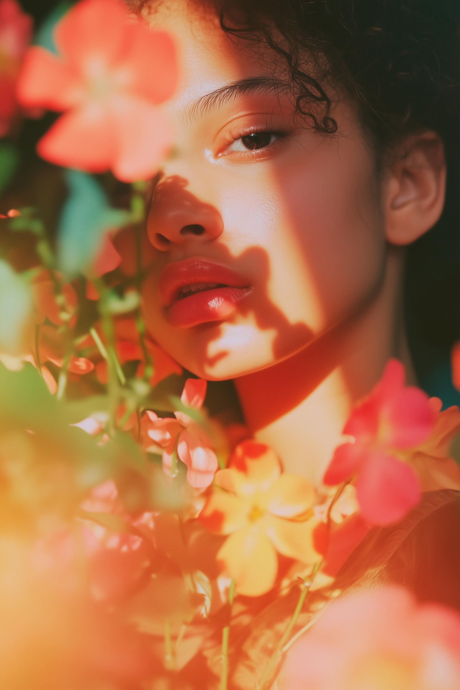 Dreamy close-up of a woman with flowers and sunlight casting shadows on her face, creating a warm, ethereal aesthetic.