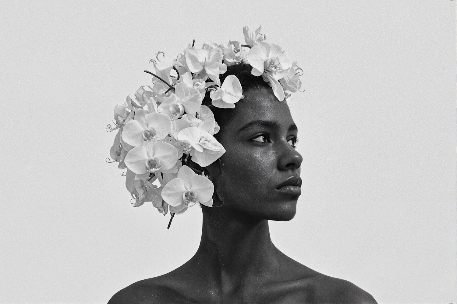 Black and white portrait of a woman with white orchids in her hair, creating a striking contrast against her dark skin.