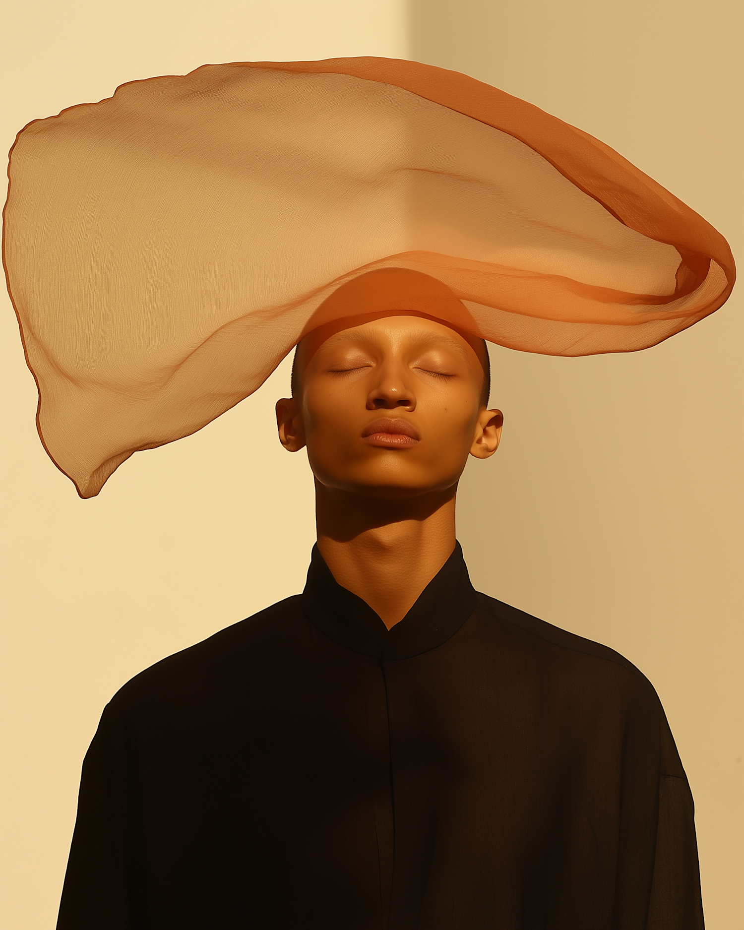 Artistic portrait of an Asian person with flowing orange fabric and serene expression, set against a warm beige background.