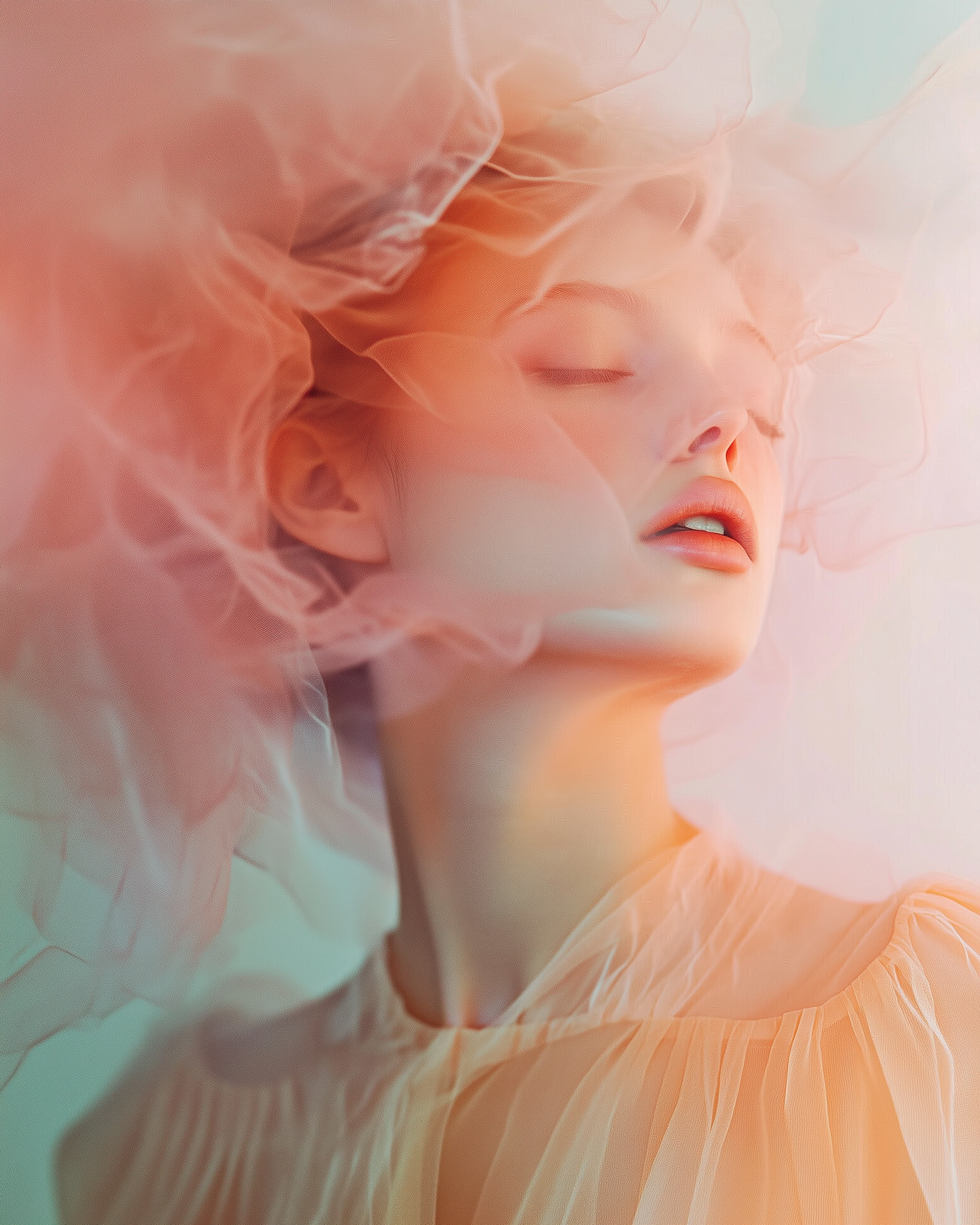 Ethereal portrait of a woman enveloped in soft, swirling fabric, creating a dreamy and serene atmosphere.