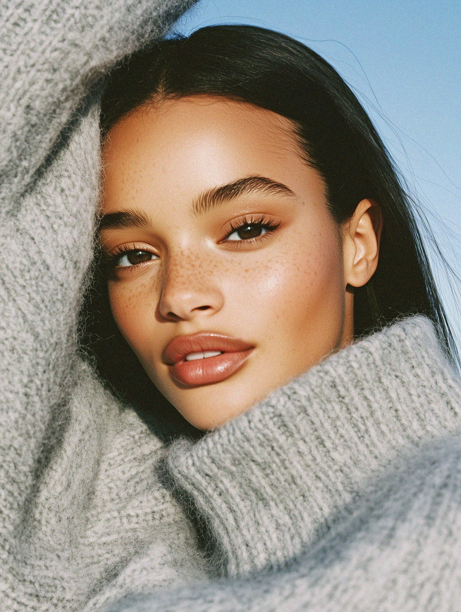 Portrait of a young woman with light brown skin, black hair, and a cozy gray sweater against a clear blue sky.