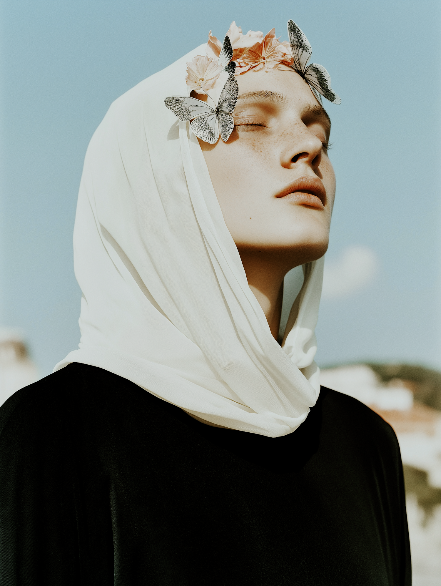 Serene woman with white headscarf, adorned with butterflies and flowers, against a clear blue sky. Peaceful and whimsical vibe.