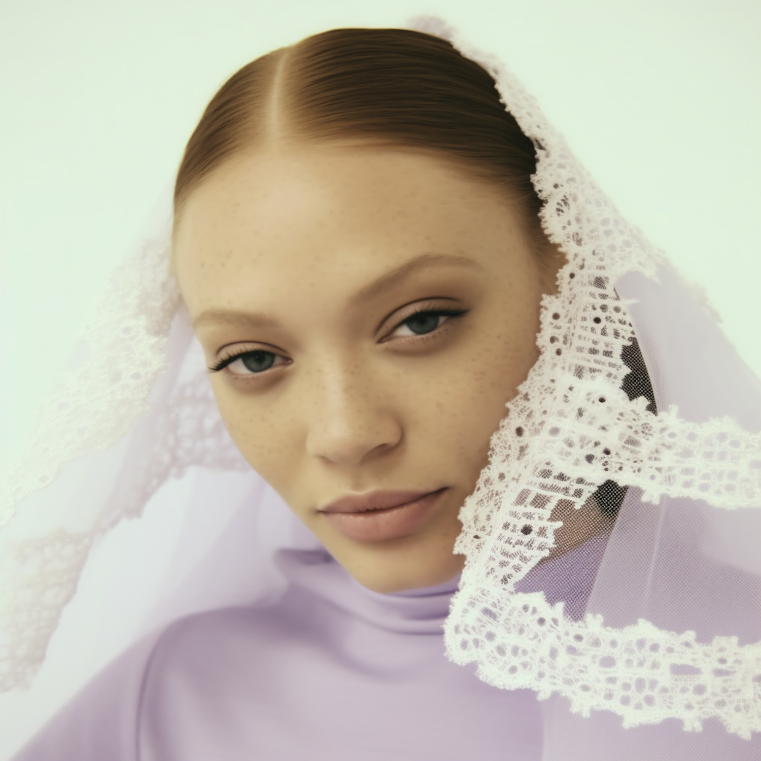 Elegant lace veil draped over a person with sleek hair, wearing a pastel garment. The intricate floral patterns add sophistication.