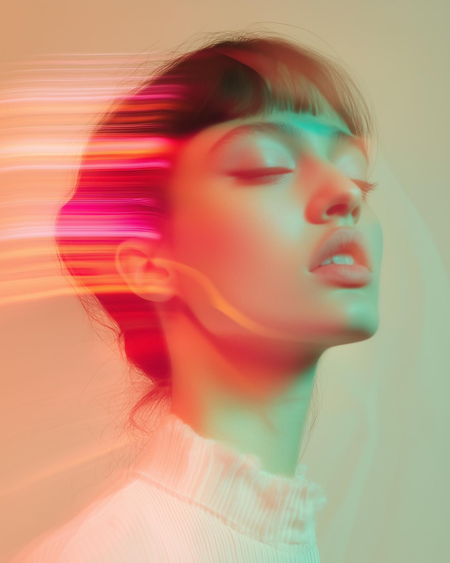 Ethereal portrait of a young woman with closed eyes, bathed in warm, flowing light streaks, creating a dreamy, introspective atmosphere.