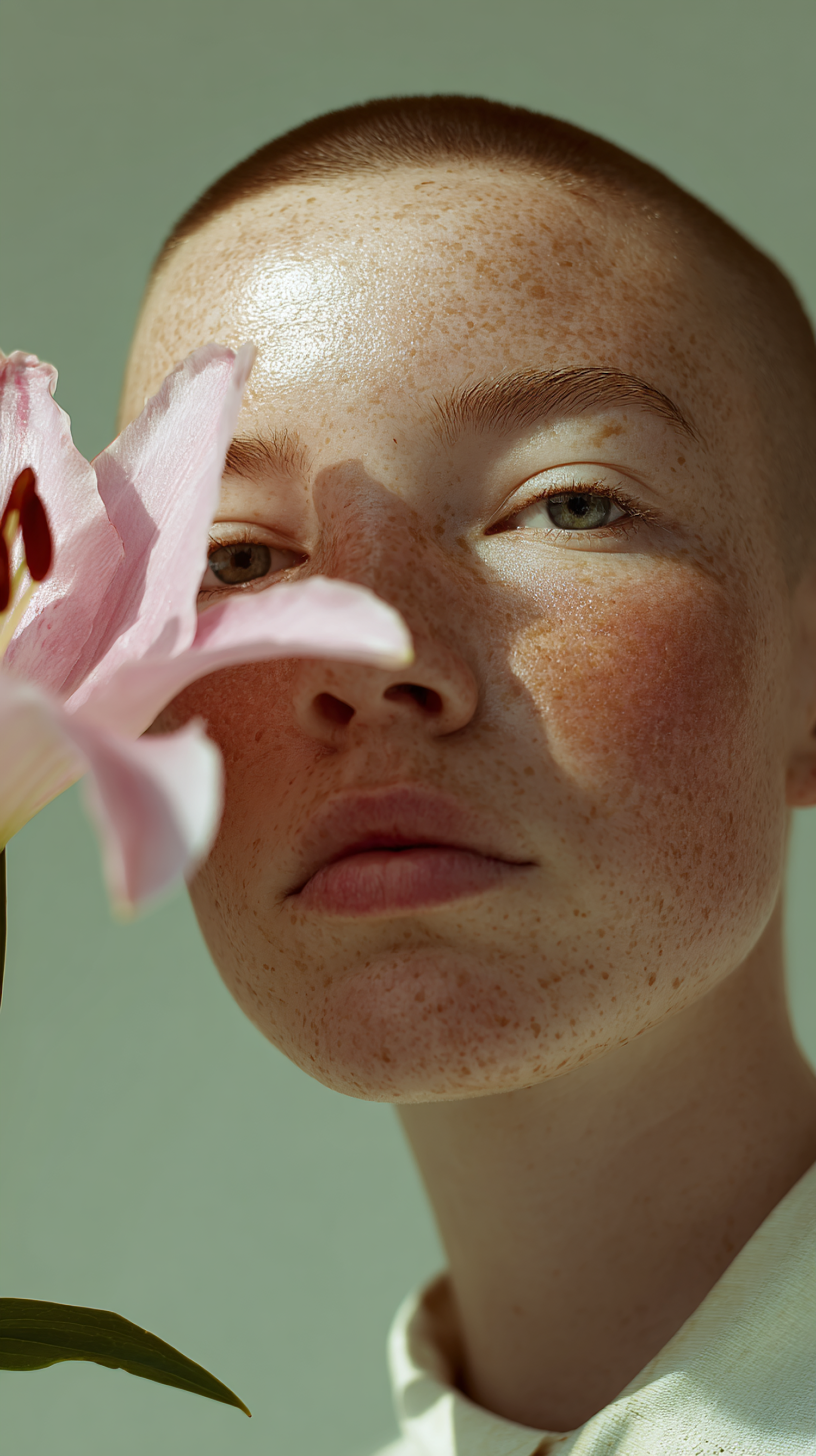 Close-up portrait of a freckled individual with a shaved head, green eyes, and a pink lily flower in the foreground.