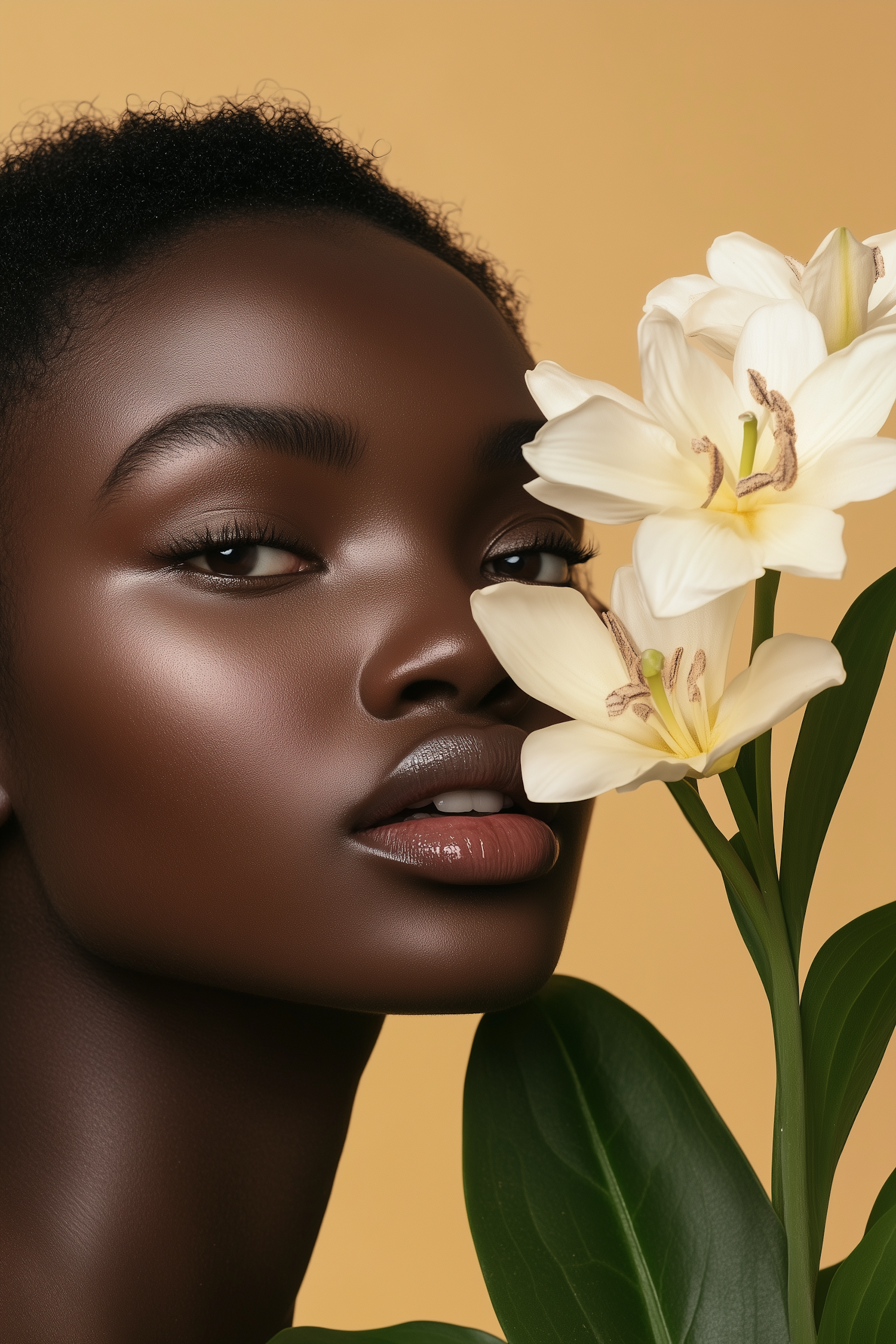 Close-up of a Black woman with a white lily against a warm yellow background, highlighting natural beauty and elegance.