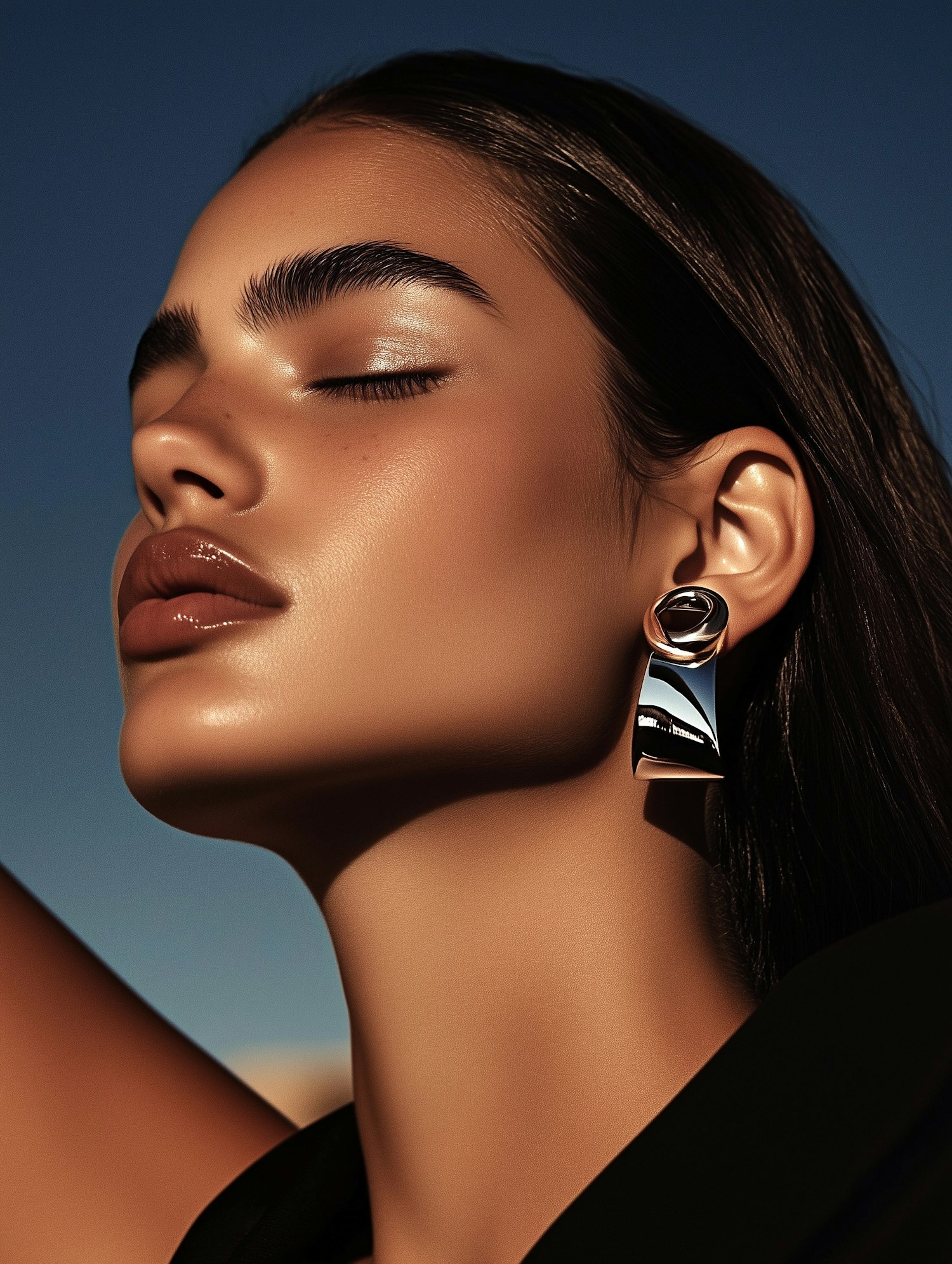 Close-up of a serene woman with radiant skin, bold metallic earrings, and sleek hair against a deep blue background.