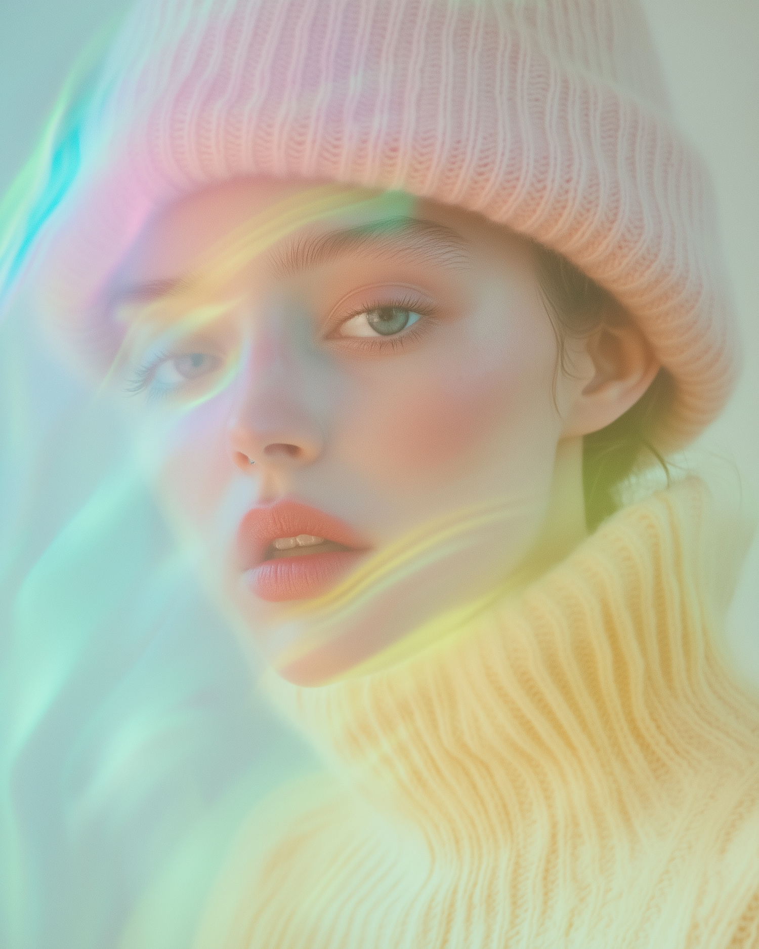 Dreamy portrait of a woman in a pink beanie and yellow sweater, bathed in ethereal multicolored light streaks.