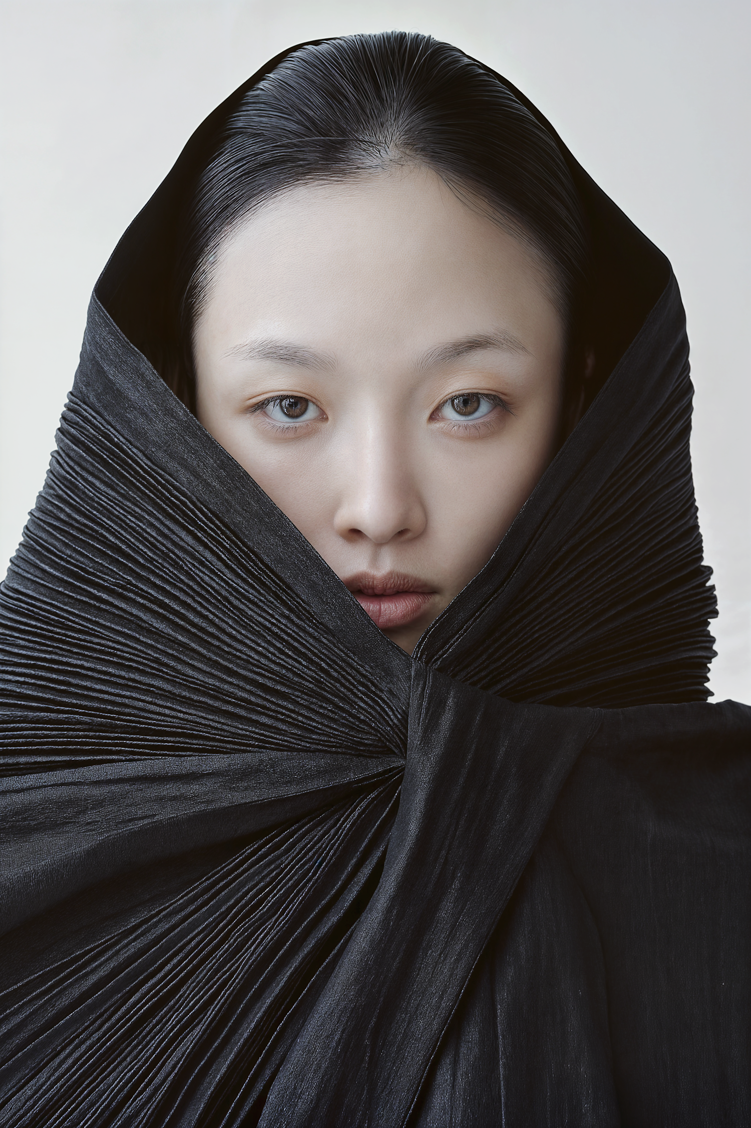 Asian woman with light blue eyes in a pleated black garment, creating a dramatic and elegant look against a neutral background.