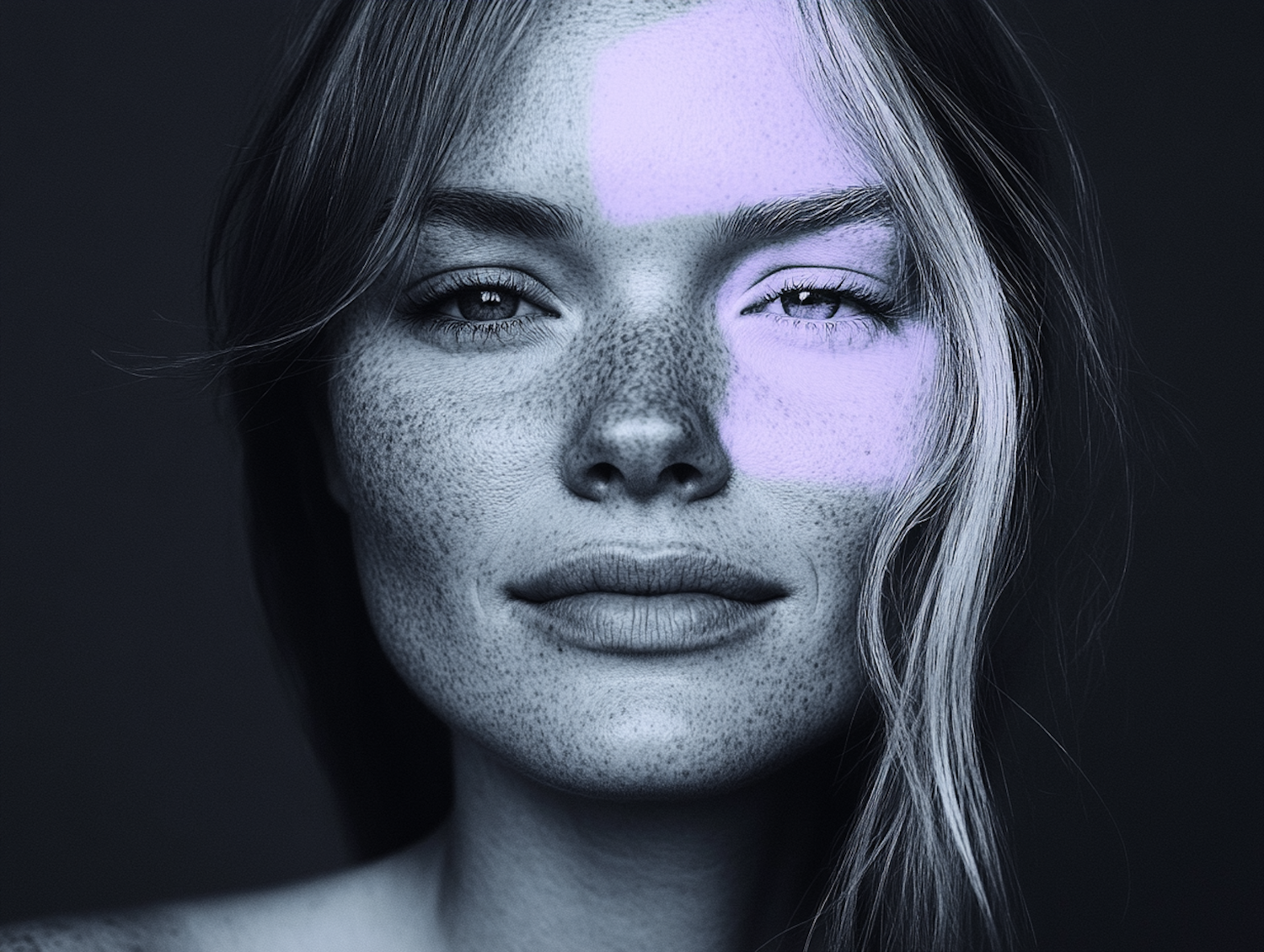 Monochrome portrait of a freckled woman with purple light accentuating her forehead and eye, creating a striking visual contrast.
